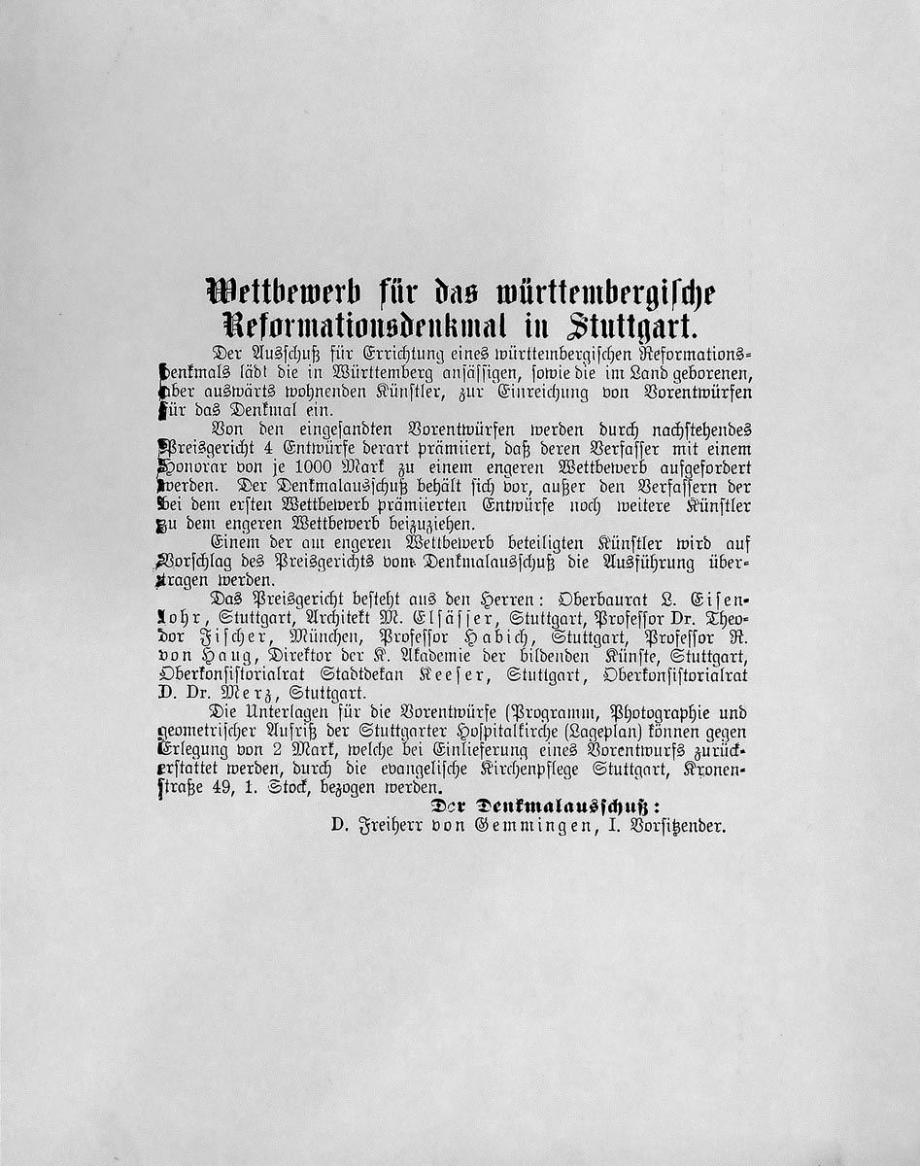 Der Ausschuss für Errichtung eines Württembergischen Reformationsdenkmals lädt die in Württemberg ansässigen, sowie die im Land geborenen aber auswärts wohnenden Künstler zur Einreichung von Vorentwürfen für das Denkmal ein.