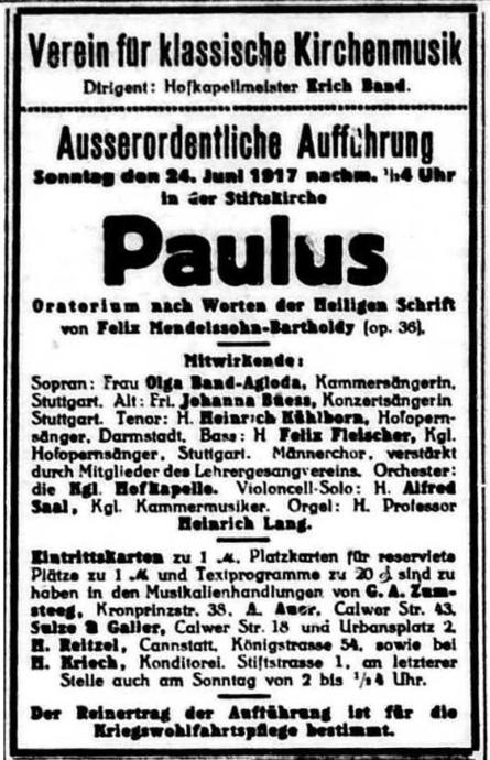 Auch der Verein für klassische Kirchenmusik stellte sich mit einer großen künstlerischen Gabe in die Reihe der froh und stolz auf ein gelungenes Kunstwerk zum Gedächtnis eines großen deutschen Befreiers blickenden Festteilnehmer. Eine große Oratorienaufführung in diesen Tagen – dazu gehört schon ein gut Teil vom Luthergeiste. „Und wenn die Welt voll Teufel wär‘!“ Und der Verein für klassische Kirchenmusik und sein Leiter Erich Band haben es wieder mit treuester Hingabe aller Kräfte und heller Kunstbegeisterung geschafft. Das tiefdringende Verständnis und die Liebe für die melodischen Schönheiten und die lebensvolle, warme Klangfülle von Mendelssohns Paulus, die der Leiter der Aufführung, der Chor, die Solisten und das Orchester dem Werk entgegenbrachten, haben schon im letzten Winter die immer seltener gewordene Erscheinung dieses Oratoriums mit neuem Glanz umgeben. Er ist auch in dieser Aufführung unvermindert erhalten geblieben. Und trotz dunkler Kriegswolken und strahlender Sommersonne hat eine große Kunstgemeinde auch diesmal wieder in der Stiftskirche in dem hellen, reinen Licht dieser Musik Erhebung und herzlichen Genuß gefunden. Der fein anregenden und sicher zusammenfassenden Führung von Erich Band, der sorgsamen, von schöner stimmlicher Begabung und lebhaftem künstlerischem Empfinden getragenen Ausführung der Solopartien durch Olga Band=Agloda, Johanna Bueß, Heinrich Kühlborn (Darmstadt) und Felix Fleischer – an dieser Stelle schon wiederholt als erfolgreich Mitwirkende gewürdigt – dem ausdrucksvoll beweglichen und einheitlichen Wirken des Chores und des Instrumentalkörpers, der Hofkapelle (Violoncell=Solo Alfred Saal) und der von Heinrich Lang gemeisterten Orgel waren diese festlich erhebenden Stunden zu danken. Die Aufführung war ein würdiger Abschluß des bedeutungsvollen kirchlichen Festtages, der unsere Stadt um ein schönes künstlerisches Zeichen rühmenden und dankbaren Gedächtnisses für große Geistestaten bereicherte.