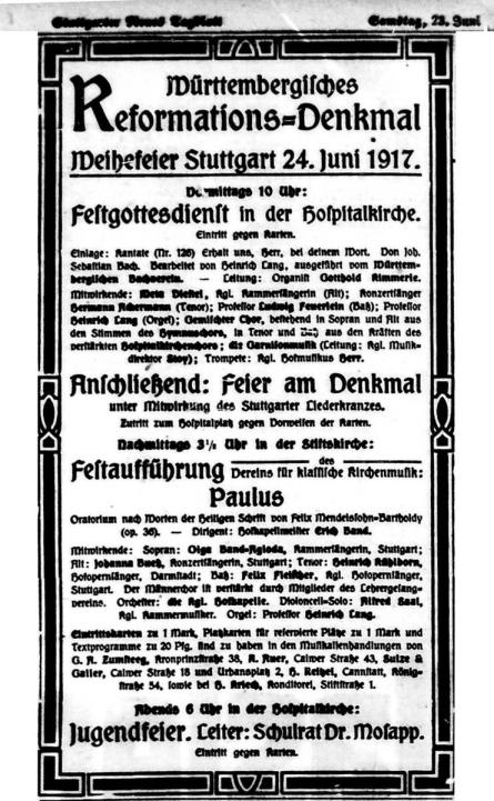 wurde durch Gemeindegesang und Gebet des Geistlichen eröffnet. Dann folgte die Kantate: „Erhalt uns, Herr, bei deinem Wort“ von J. S. Bach zur Aufführung. Das aus dem Geist der Reformationszeit geschöpfte Werk des großen Meisters, das an diesem Tag zum erstenmal in Württemberg durch den Württ. Bachverein zu Gehör gebracht wurde, eignete sich hervorragend für eine Festfeier zum Gedächtnis an die deutsche Reformation mitten im Weltkrieg und fand unter Leitung von Organist Kimmerle eine in allen Teilen wohlgelungene Wiedergabe. Eine tiefe Wirkung ging aus von den durch den verstärkten Hospitalkirchenchor mit Begleitung der Garnisonmusik unter Leitung des Kgl. Musikdirektors Stotz prächtig ausgeführten, weihevollen Chören, während die Solisten, Kgl. Kammersängerin Meta Diestel, Konzertsänger H. Ackermann, Professor L. Feuerlein in den zu Herzen dringenden Rezitativen und Arien ihr Bestes gaben.