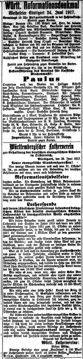 Die Feier nahm ihren Anfang mit einem Festgottesdienst in der Hospitalkirche. Nach dem Gesang der Gemeinde, die den Raum der ehrwürdigen Reformationskirche bis zum letzten Platz füllte und dem Gebet des Geistlichen kam die Kantate: Erhalt uns, Herr, bei deinem Wort von J. S. Bach zur Aufführung. Das aus dem Geist der Reformation geschöpfte Werk des großen Meisters, das an diesem Tag zum erstenmal in Württemberg durch den Württ. Bachverein zu Gehör gebracht wurde, eignete sich hervorragend für eine Festfeier zum Gedächtnis an die unvergänglichen Segnungen der deutschen Reformation und fand unter Leitung von Organist Kimmerle eine in allen Teilen wohlgelungene Wiedergabe. Eine tiefe Wirkung ging aus von den durch den verstärkten Hospitalkirchenchor mit Begleitung der Garnisonmusik unter Leitung des Kgl. Musikdirektors Stotz prächtig ausgeführten, weihevollen Chören, während die Solisten Kgl. Kammersängerin Meta Diestel, Konzertsänger H. Ackermann, Prof. L. Feuerlein in den zu Herzen dringenden Rezitativen und Arien ihr Bestes gaben. Die Festpredigt, die Stadtpfarrer Gauger hielt, wußte in anfassenden Ausführungen dem Ausdruck zu geben, was die feiernde evangelische Gemeinde der Gegenwart in dankbarem Gedenken an das große Erbe der Vergangenheit und in hoffnungsstarkem Ausblick in die Zukunft bewegt. Im Anschluß an das Textwort Hebräer 13, 7: „Gedenket an eure Lehrer, die euch das Wort Gottes gesagt haben“, führte der Redner aus: