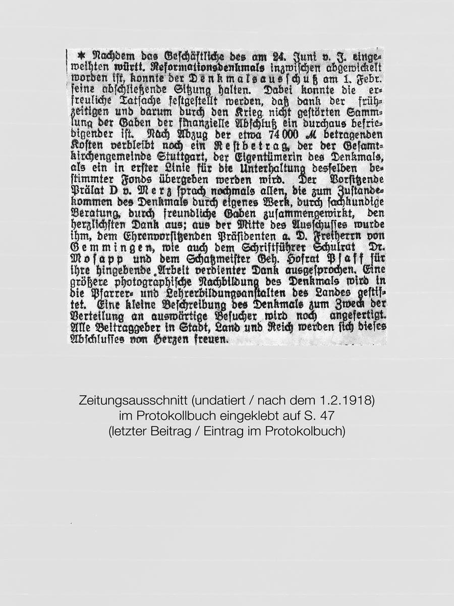 Im Namen des Denkmalausschusses übergebe ich Ihnen, Herr Oberkirchenrat, als Vertreter der evang. Gesamtkirchengemeinde Stuttgart, dieses Denkmal zu treuer Pflege und, wie wir hoffen, zu segensreicher Erinnerung an die Vierhundertjahrfeier der Reformation! Das walte Gott.“