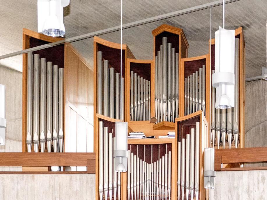 Rundblick (im Uhrzeigersinn) von links hinten (Andachtsraum) zur Mitte mit Gegenblick / nach rechts hinten (Begegnungsraum) · Orgel