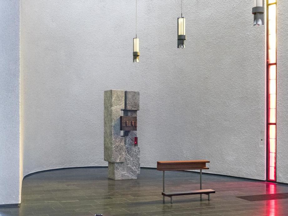 Die Tabernakelstele findet ihren Ort in der ehemaligen Werktagskapelle, umschlossen von der Rundung der Wand wie die Perle in einer Muschel. Dieser Raum wird zum Andachtsraum und Ort der stillen Anbetung.