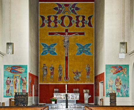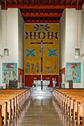 Die Wandfresken des Altarraumes sind im Jahre 1958 von Professor Wilhelm Geyer aus Ulm geschaffen worden. Das Herz-Jesu-Geheimnis wird in drei Themenkreisen auf den Grundtönen Ockergelb, Rot und Grün dargestellt. Auf der Rückwand des Altarraumes ist „die Länge und Breite, die Höhe und Tiefe" der Liebe Christi veranschaulicht, wie sie uns in Eph 3, 8-12.14-19 verkündet wird: