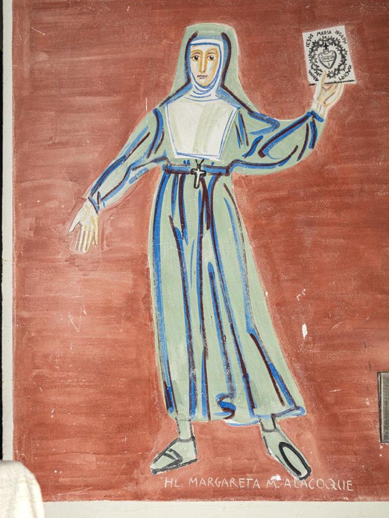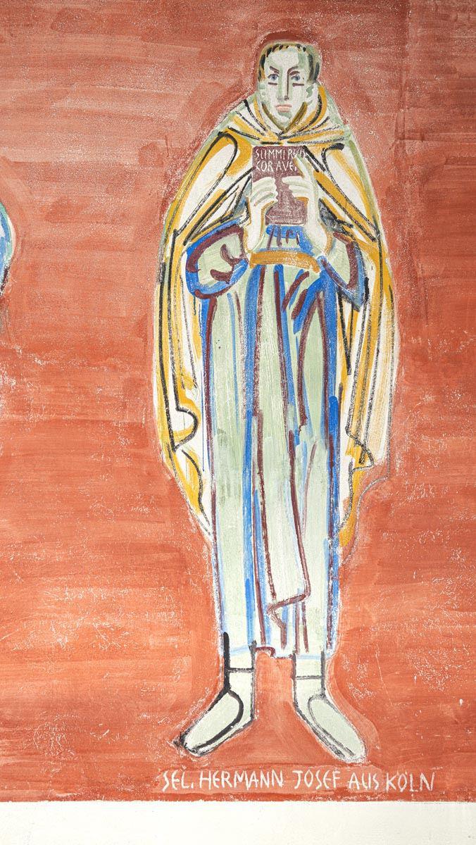 Auf der ockergelben Stirnwand sehen wir das Kreuzesgeschehen in seiner Himmel und Erde, Gott und Menschheit umgreifenden Dimension. Die Fresken an den Seitenwänden auf rotem Grund zeigen Frauen und Männer, welche der Herz-Jesu-Verehrung im weitesten Sinne prägende Impulse gegeben haben. An den Wänden, am Eingang des Altarraumes, sehen wir auf grünem Grund zwei Szenen des Alten Testamentes, die auf das Geheimnis der Liebe Gottes in Jesus Christus verweisen.