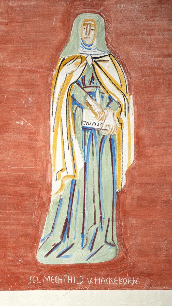 Auf den Seitenwänden sind links Frauen und rechts Männer, die das Geheimnis des Herzens Jesu verkündet und verehrt haben, abgebildet. Thomas wird am achten Tag nach der ersten Erscheinung des Herrn von diesem aufgefordert, seine Hand in seine Seite zu legen. Er bekennt: „Mein Herr und mein Gott" (Joh 20,28). Neben ihm steht der selige Hermann Josef von Köln, der Dichter des lateinischen Hymnus: „Summi regis cor, aveto" „O Herz des Königs aller Welt" (übersetzt von Paul Gerhard 1656) und daneben Heinrich Seuse aus Konstanz, begraben in Ulm. Er war ein begnadeter Mystiker. Er wird dargestellt mit dem Monogramm des Namens Jesu auf seinem Herzen. Maria von Magdala führt die Reihe der Frauen auf der linken Seite an. Sie nimmt diesen Platz ein, weil sie zu den Frauen gehörte, die Jesus begleiteten und unter dem Kreuz ausharrten. Am Ostermorgen wurde ihr als erste unter den Begleitern Jesu die Begegnung mit dem auferstandenen Herrn zuteil. Ihr folgen die großen Mystikerinnen des Mittelalters: Mechthild von Hackeborn und Gertrud von Helfta. Zuletzt ist Maria Margareta Alacoque, die Erweckerin der Herz-Jesu-Verehrung (1647-1690) im 17. Jahrhundert nach einem Bild aus Paray-Ie-Monial dargestellt.