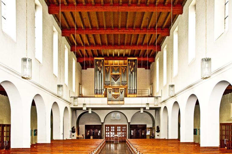 Acht hohe Rundbogenfenster im Hauptschiff, ein Rundfenster in der Westfassade und sechs rechteckige Fenster mit einem abschließenden Rundfenster in den Seitenschiffen erfüllen den Innenraum mit viel Licht.