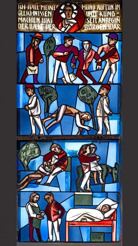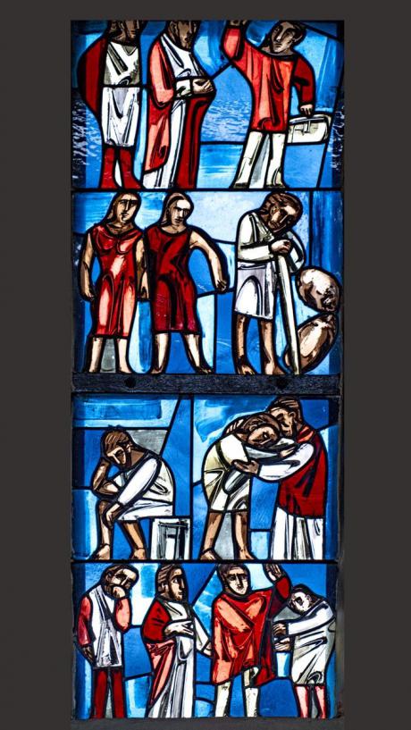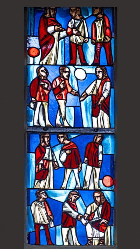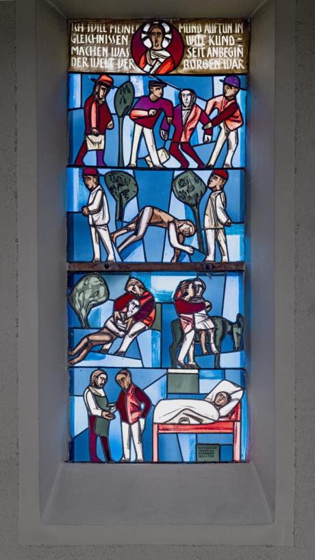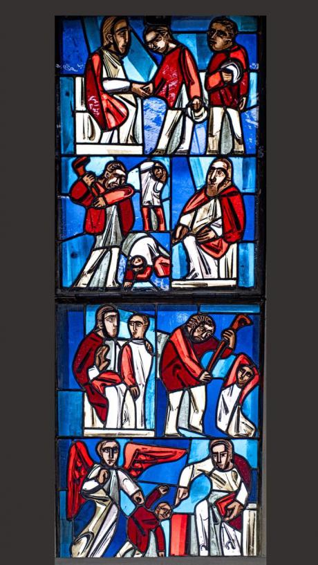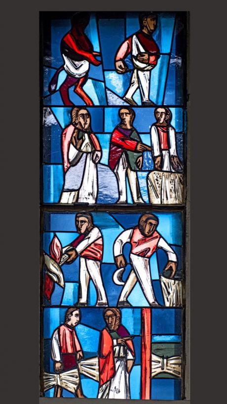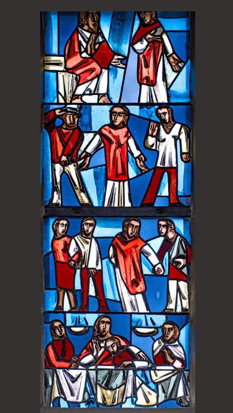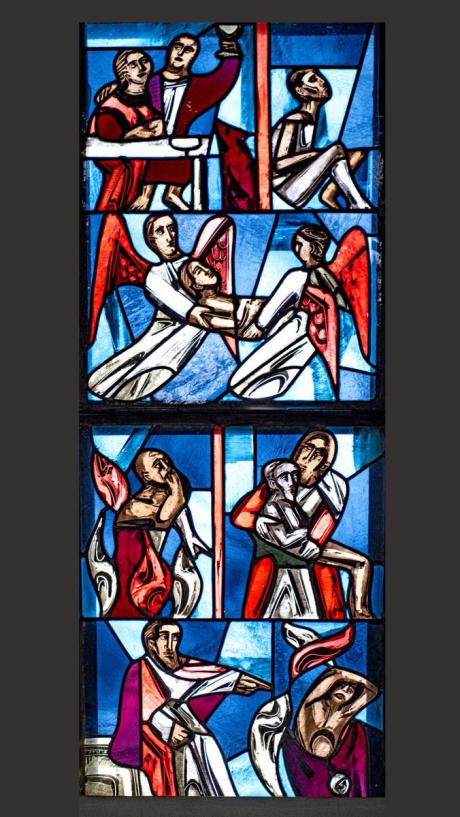5.01 + 5.02: Fenster in der Kinderkapelle (Wilhelm Geyer) Gethsemane / Kreuzigung · Der ungläubige Thomas / Die Emmaus-Jünger
