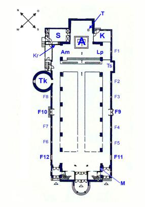 Der Einfachheit halber wird nachfolgend von Osten = Ausrichtung des Chores, Westen = Hauptzugang, Nord & Süd = Seitenwände gesprochen