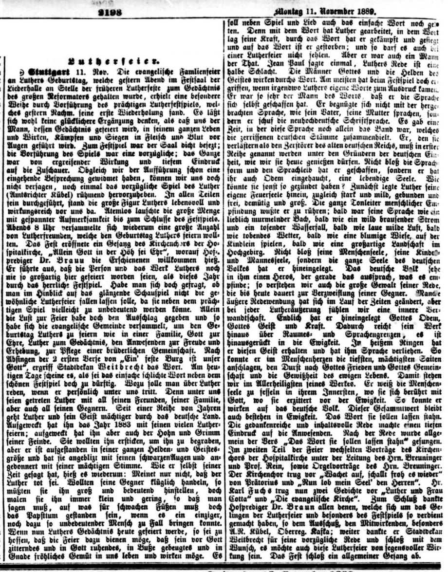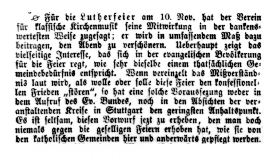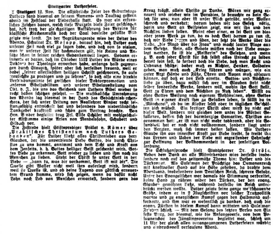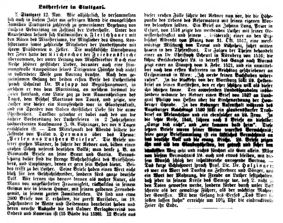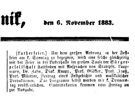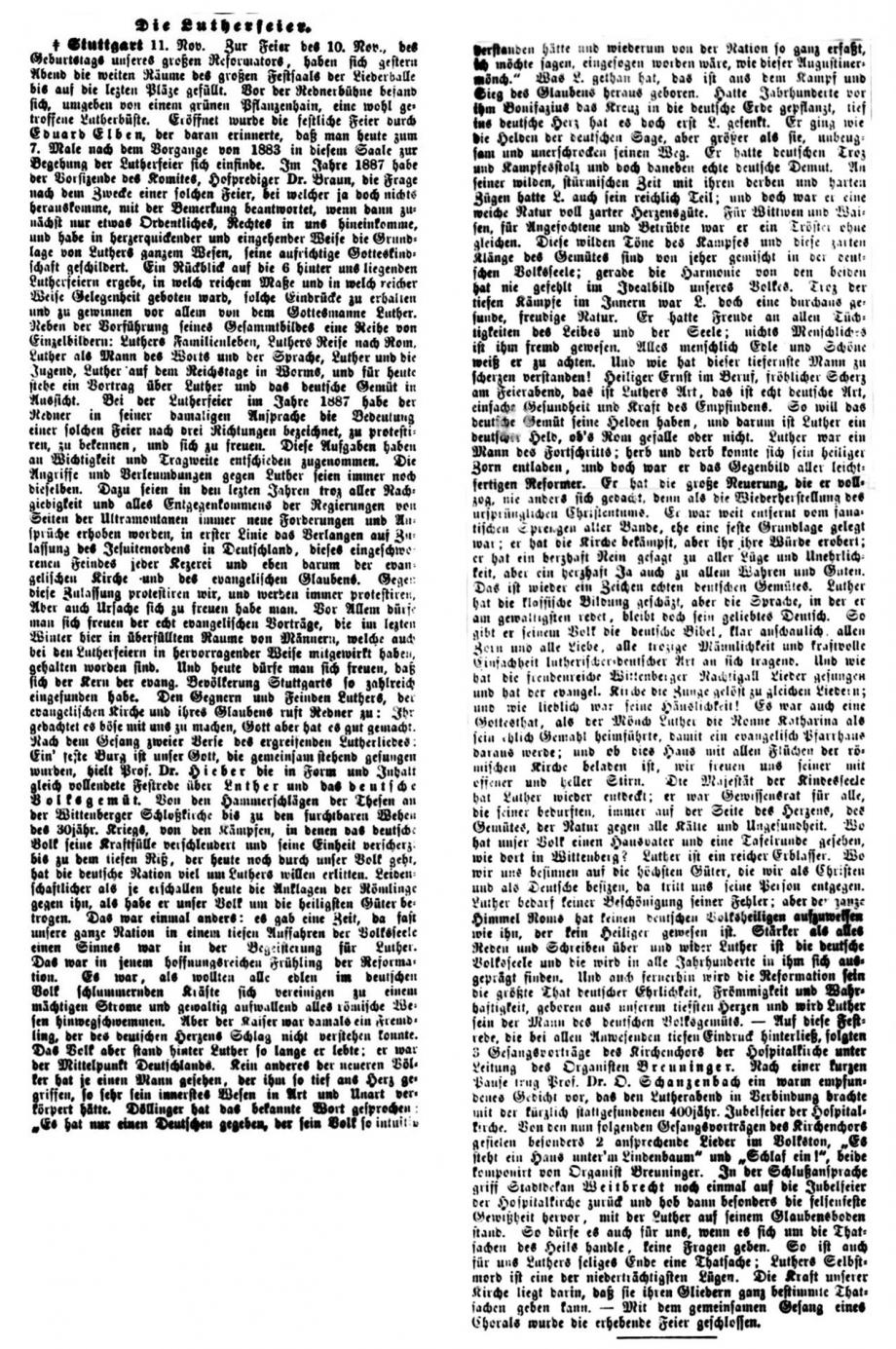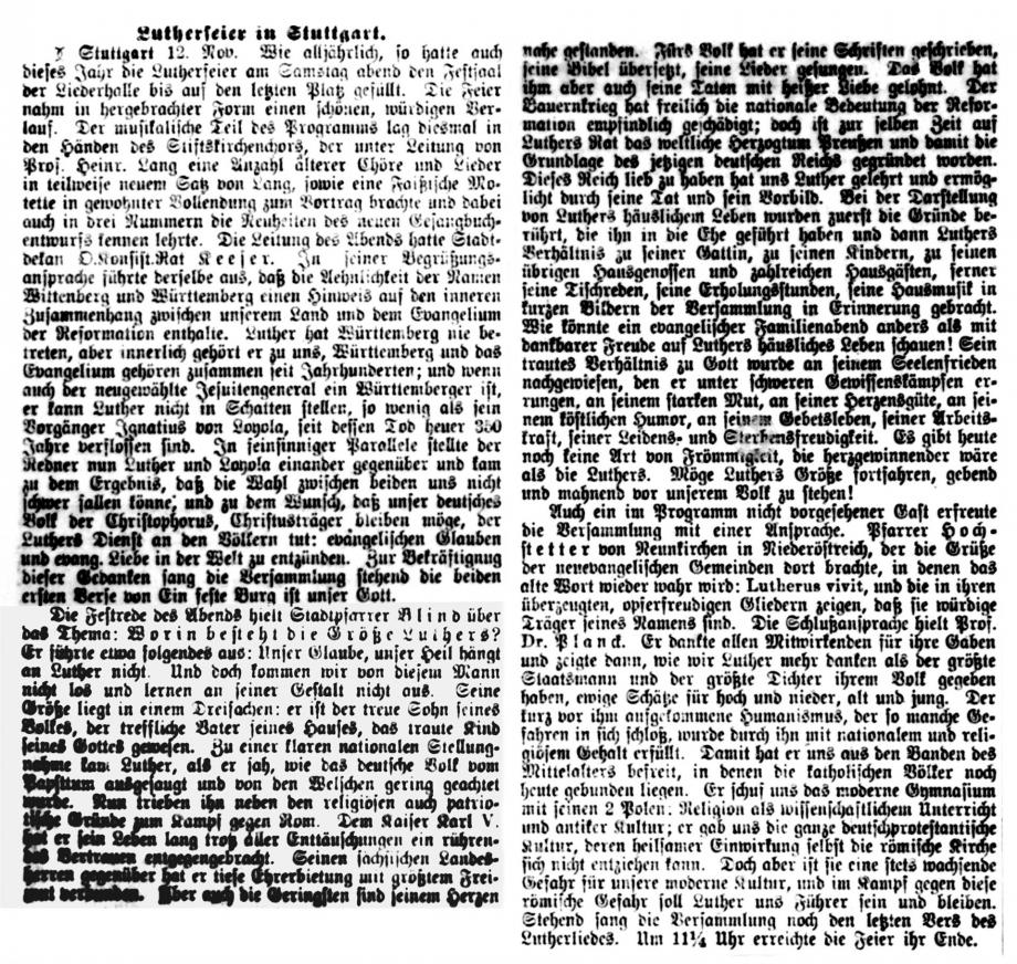 Nach dem großen Gedenkjahr 1883 findet jährlich im November eine Luther-Feier in Stuttgart statt, über die auch die Schwäbische Kronik berichtet (1899 + 1915 fehlen). Da die Ausgaben 1884 in sehr schlechtem Zustand sind, hier eine Abschrift, danach Scan von Mikrofilmen in der WLB Stuttgart: