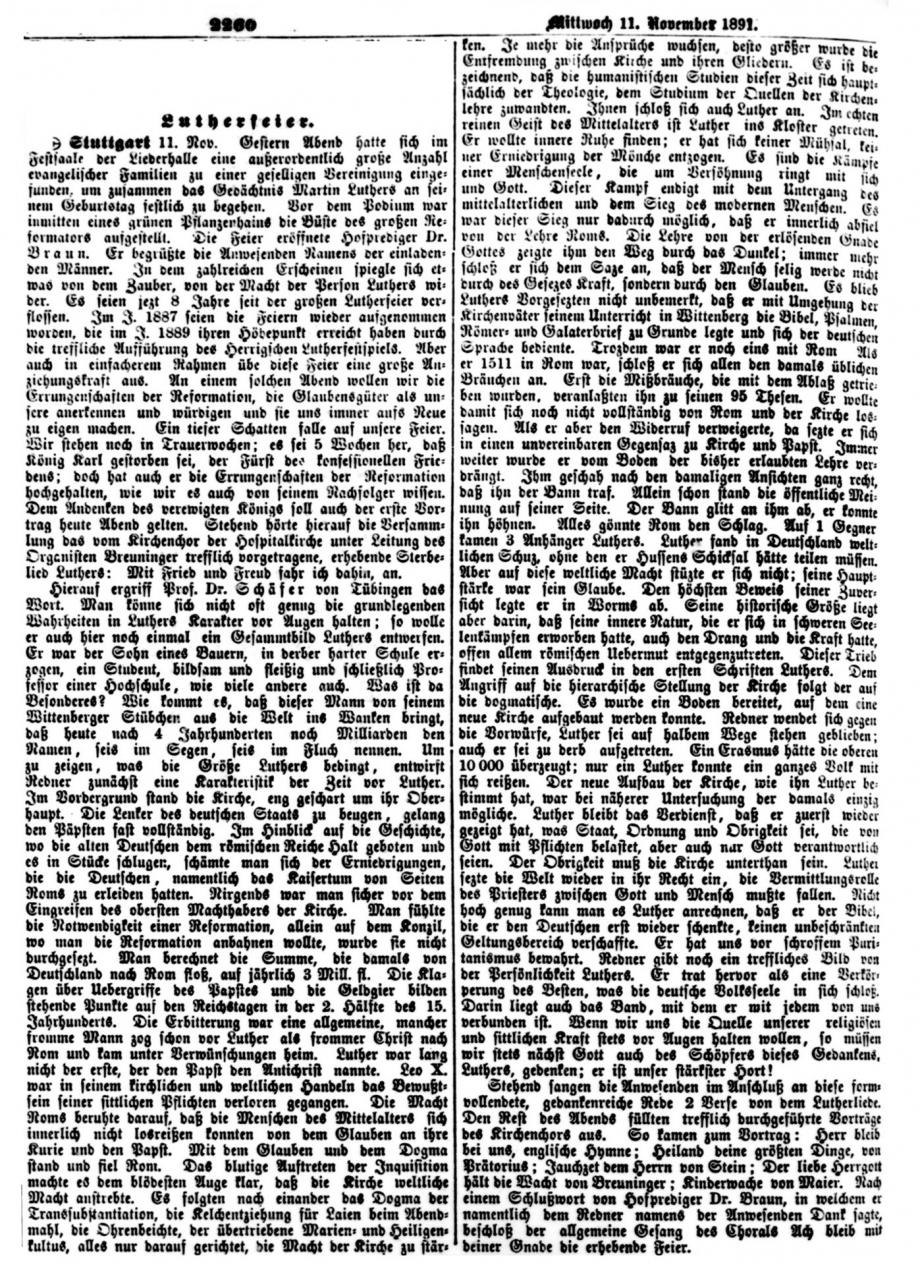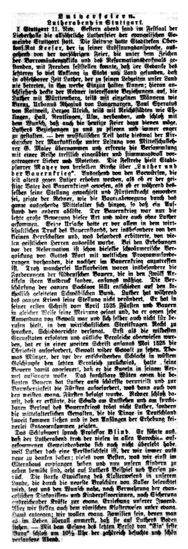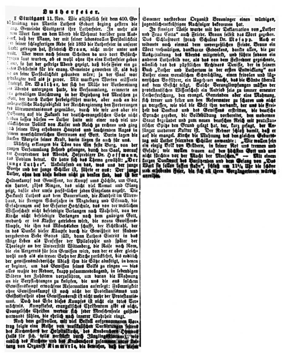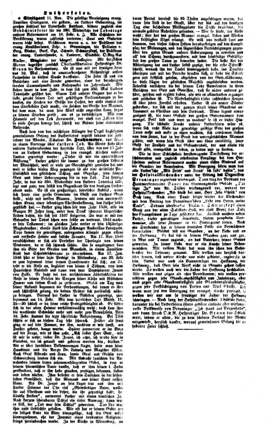 Nach dem großen Gedenkjahr 1883 findet jährlich im November eine Luther-Feier in Stuttgart statt, über die auch die Schwäbische Kronik berichtet (1899 + 1915 fehlen). Da die Ausgaben 1884 in sehr schlechtem Zustand sind, hier eine Abschrift, danach Scan von Mikrofilmen in der WLB Stuttgart: