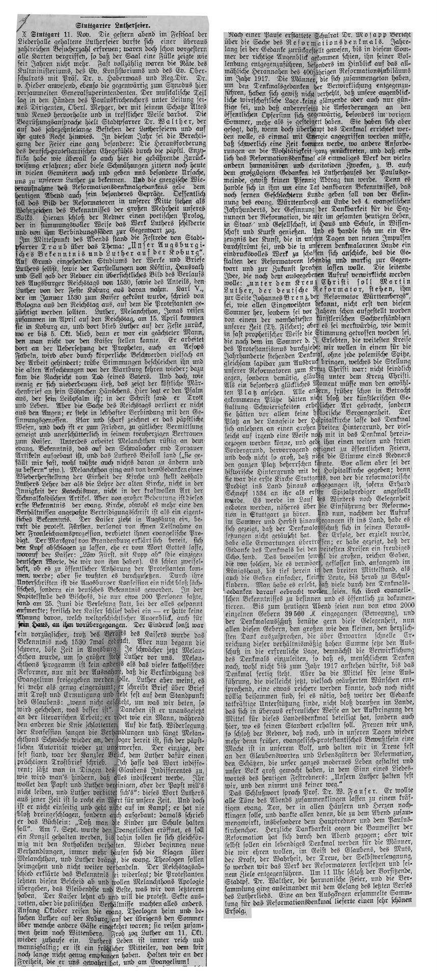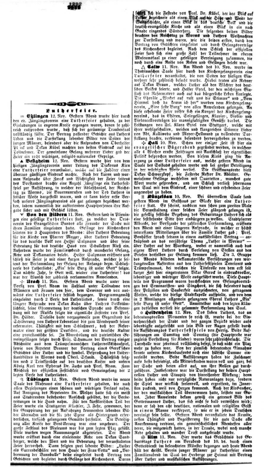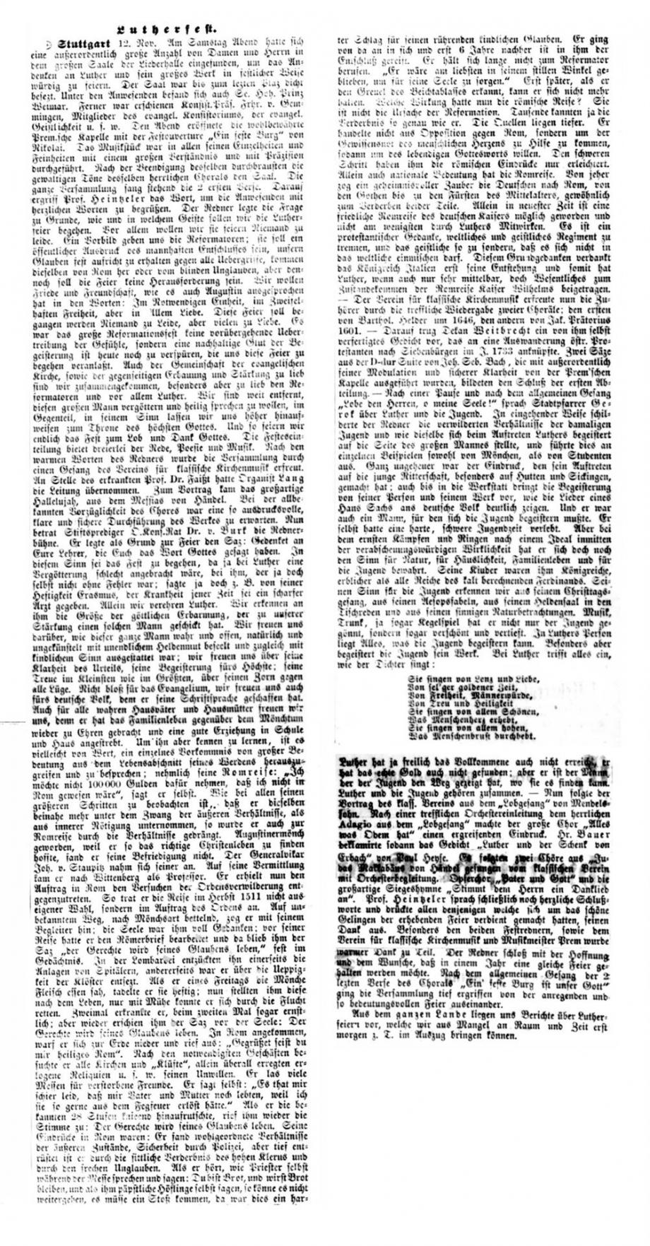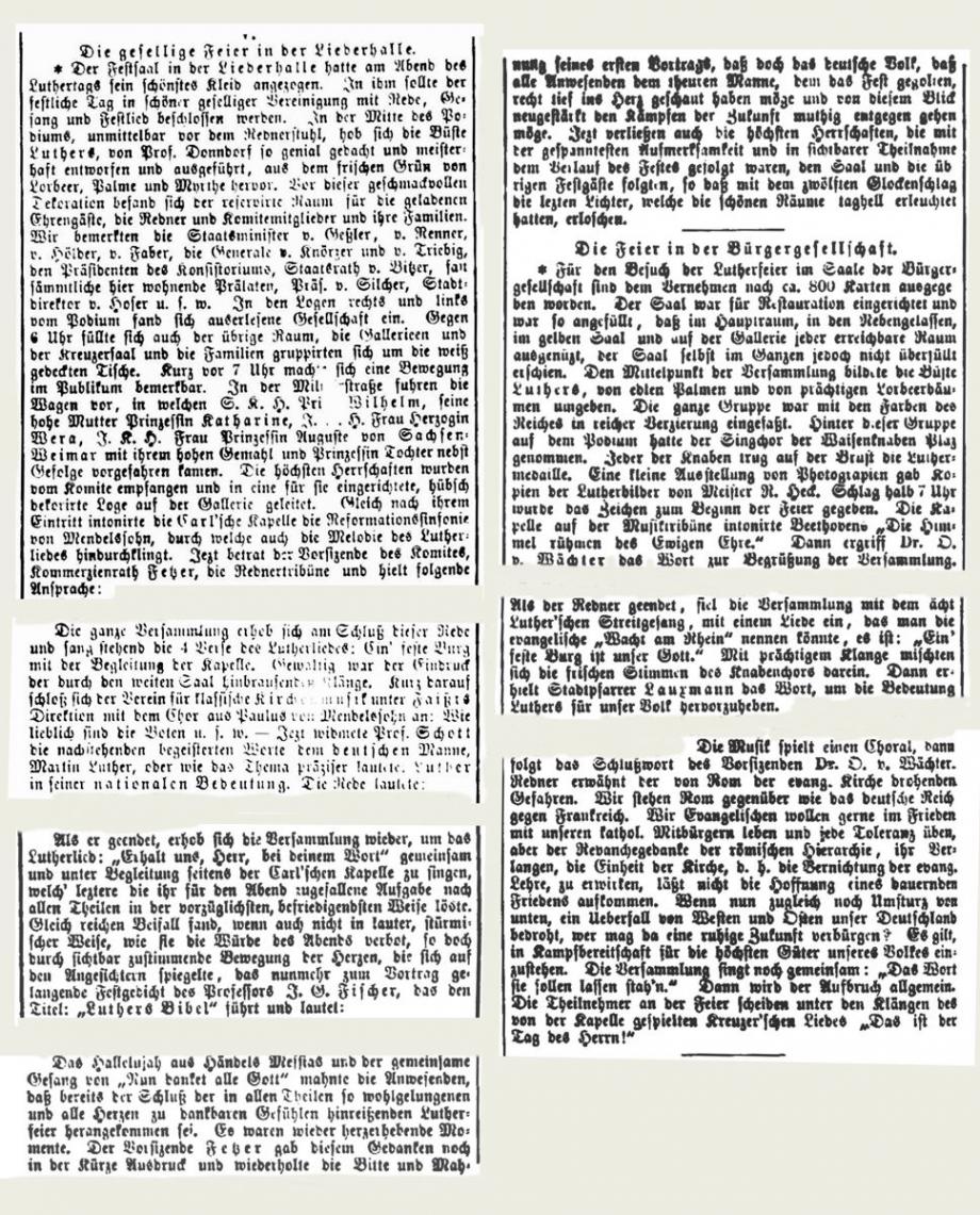 Nach dem großen Gedenkjahr 1883 findet jährlich im November eine Luther-Feier in Stuttgart statt, über die auch die Schwäbische Kronik berichtet (1899 + 1915 fehlen). Da die Ausgaben 1884 in sehr schlechtem Zustand sind, hier eine Abschrift, danach Scan von Mikrofilmen in der WLB Stuttgart: