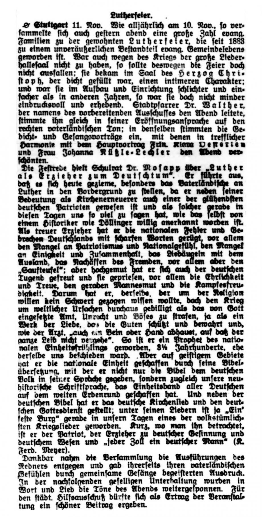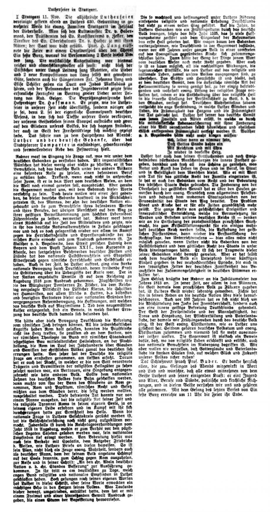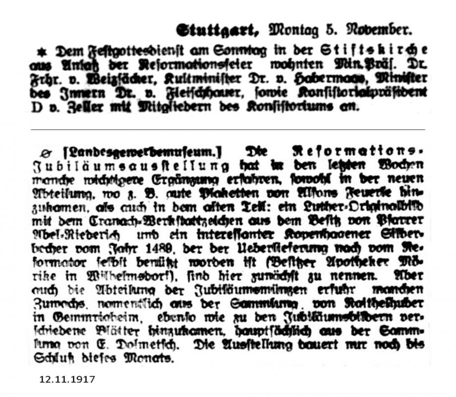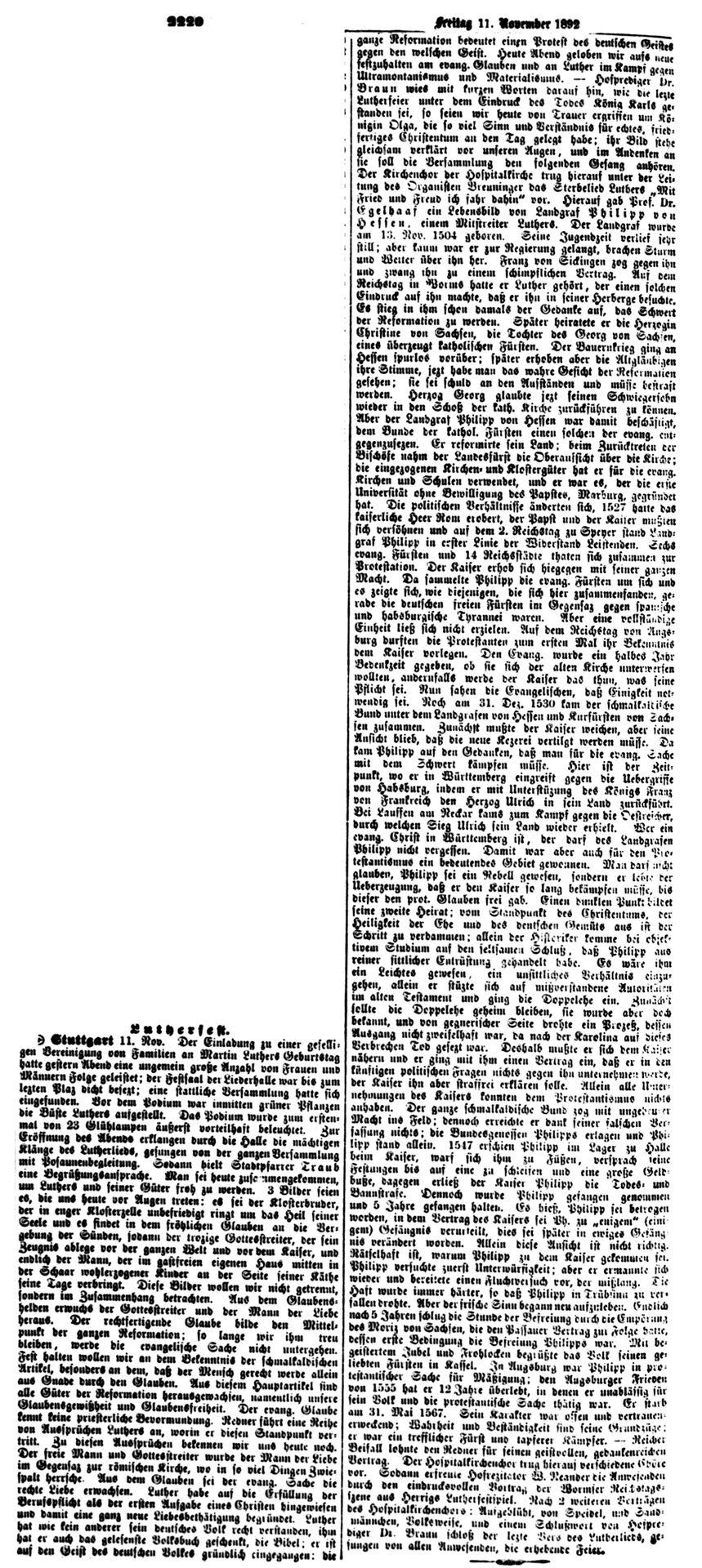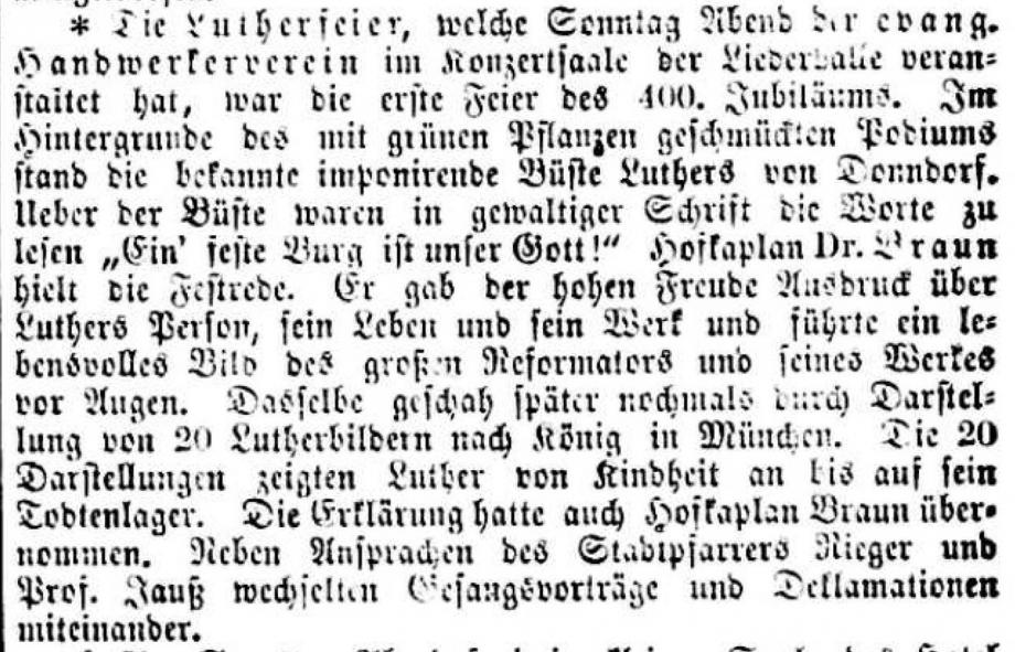 Nach dem großen Gedenkjahr 1883 findet jährlich im November eine Luther-Feier in Stuttgart statt, über die auch die Schwäbische Kronik berichtet (1899 + 1915 fehlen). Da die Ausgaben 1884 in sehr schlechtem Zustand sind, hier eine Abschrift, danach Scan von Mikrofilmen in der WLB Stuttgart: