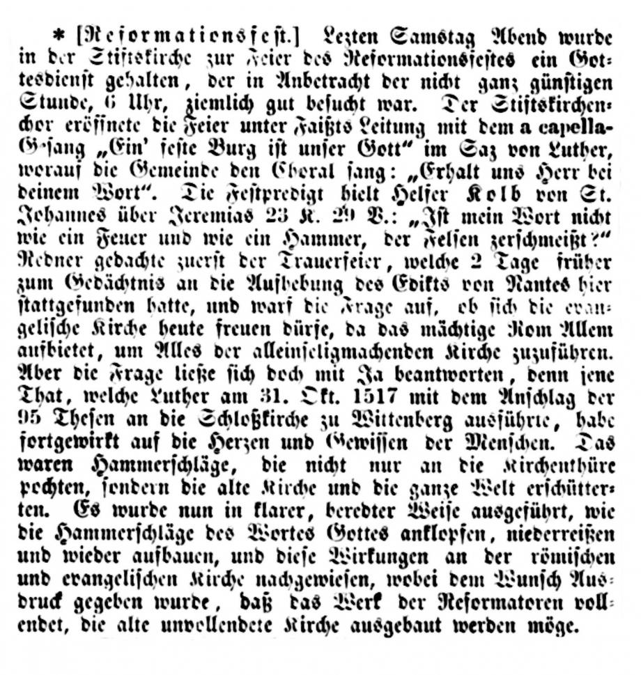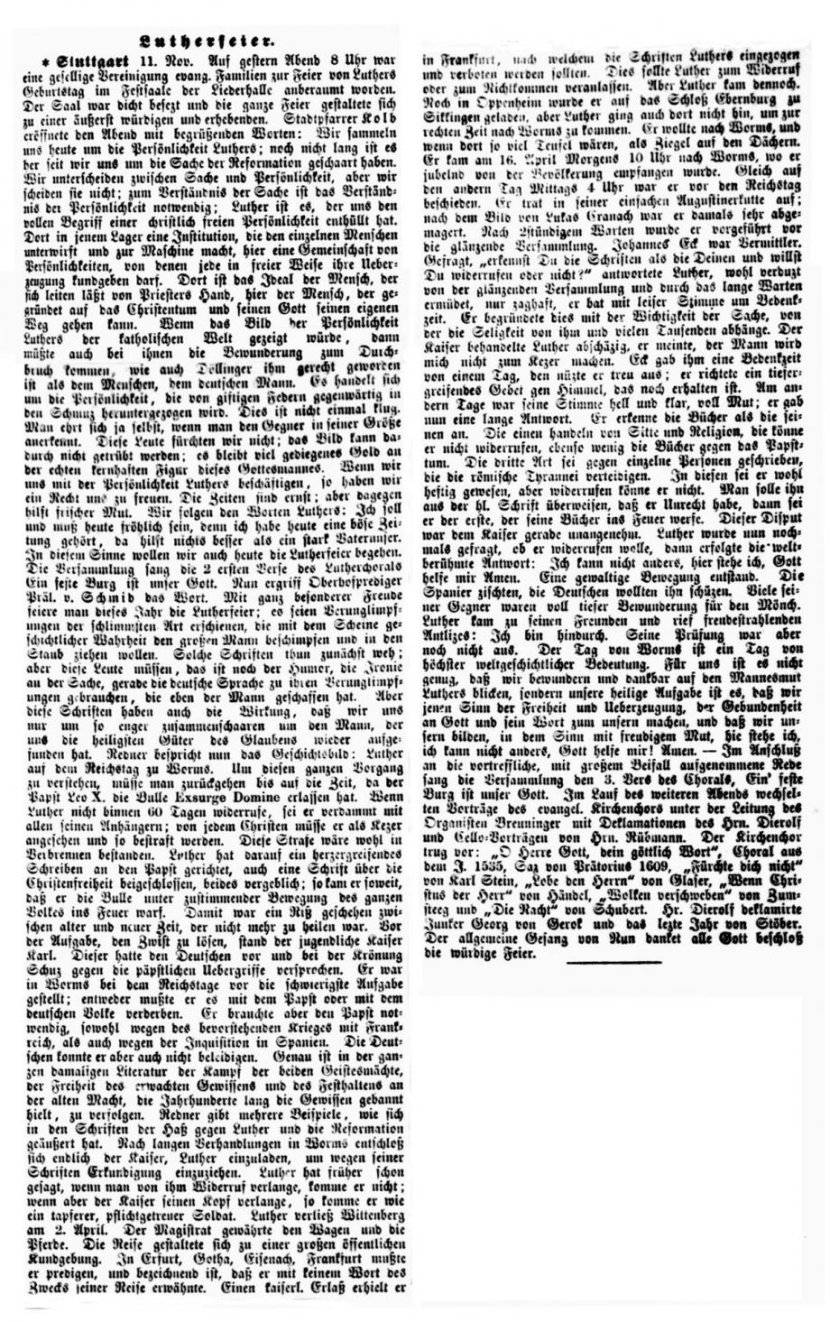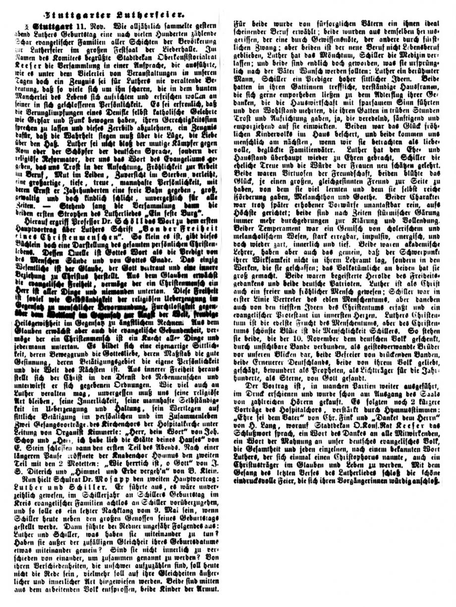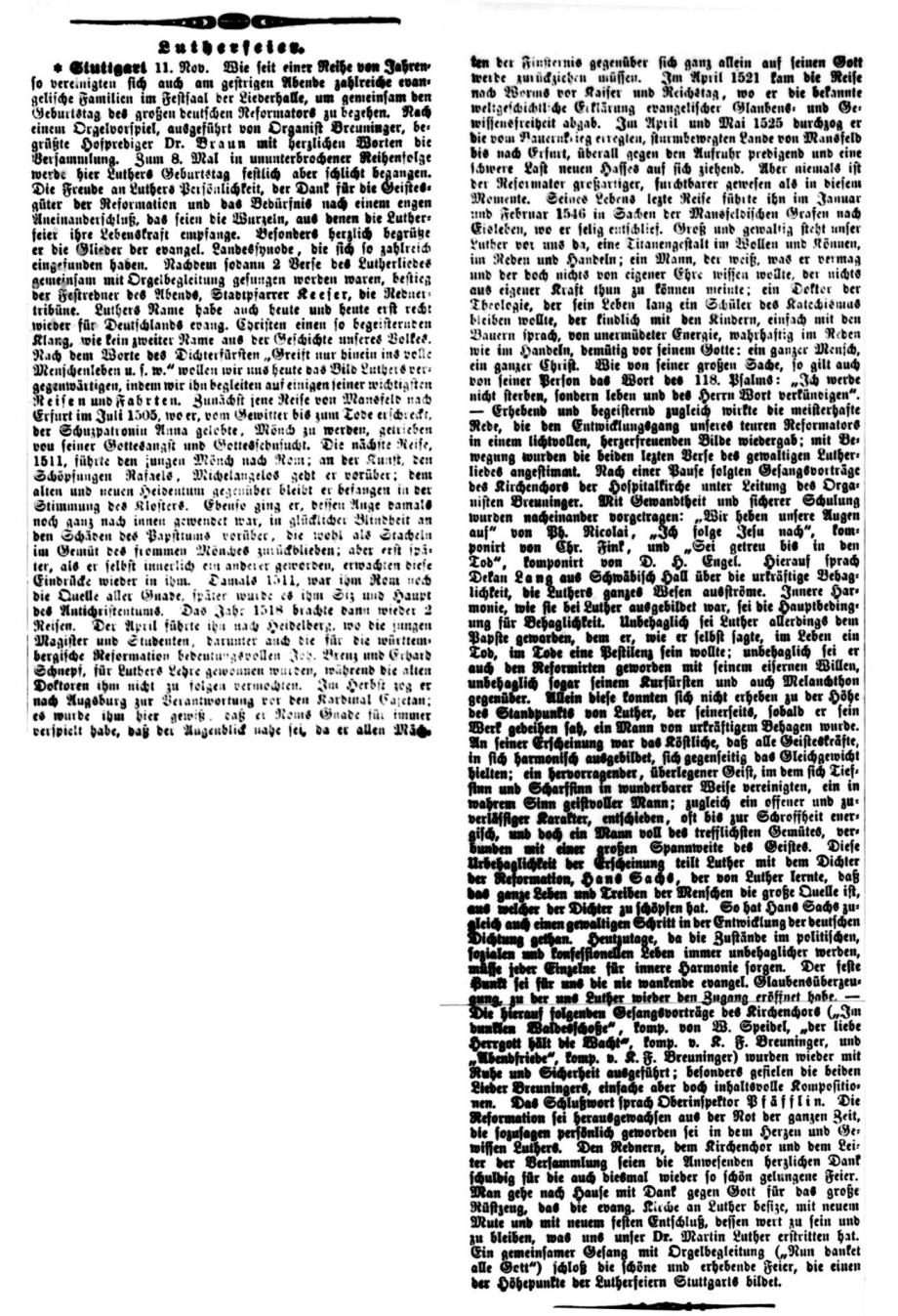 Stuttgart 1. Nov. Das Reformationsfest wurde gestern Abend in der Stiftskirche mit einem Gottesdienste gefeiert, der mit dem Vortrag des Lutherliedes „Ein‘ feste Burg“ durch den Stiftskirchenchor (Saz von Luther selbst) eröffnet wurde. Die Gemeinde sang Luthers Lied „Nun freut euch, lieben Christen g’mein“, worauf Helfer Gerock die Festpredigt hielt über die Worte des Proph.: „Aber auf dem Berge Zion sollen Etliche errettet werden und sollen Heiligtum sein“. Der Redner rief den Zuhörern als Nachlese des vor einem Jahre gefeierten Lutherjubiläums drei Reformationskleinodien ins Gedächtnis zurück, welche die Schule, die Kirche und das Haus durch Luther erhielten und die in der Bibel als Mittelpunkt der von ihm gegründeten deutschen Schule, in der Lehre von der Gerechtigkeit des Glaubens für die deutsche, evangelische Kirche und in der Einführung des deutschen Hauses bestehen, welch letzteres Luther selbst gründete, als er von der geistlichen Ehelosigkeit herabsteigend zum Traualtare trat. - -