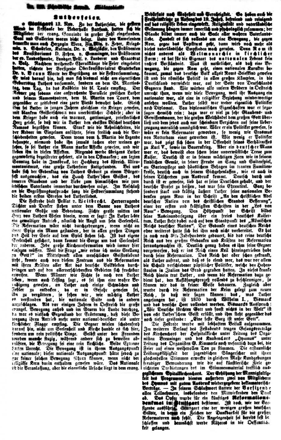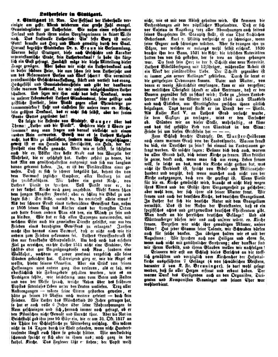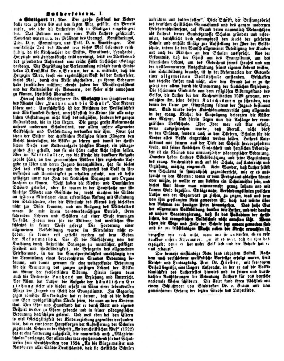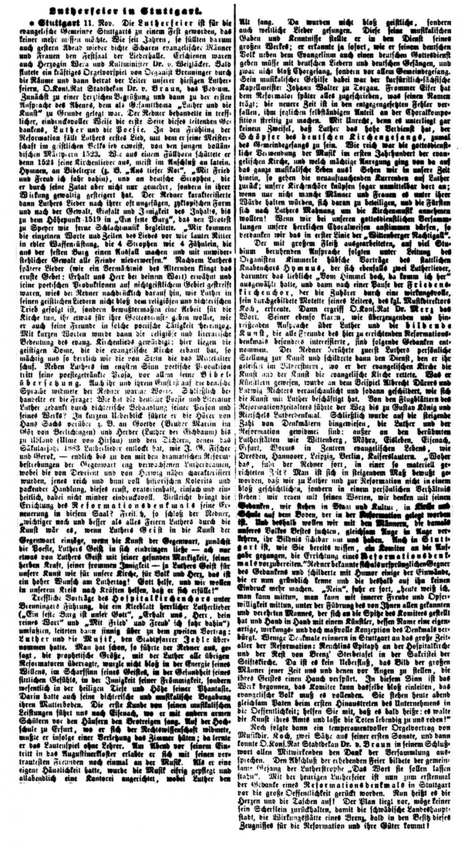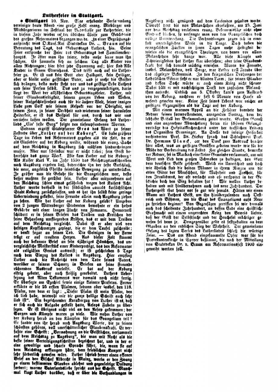 Stuttgart 1. Nov. Das Reformationsfest wurde gestern Abend in der Stiftskirche mit einem Gottesdienste gefeiert, der mit dem Vortrag des Lutherliedes „Ein‘ feste Burg“ durch den Stiftskirchenchor (Saz von Luther selbst) eröffnet wurde. Die Gemeinde sang Luthers Lied „Nun freut euch, lieben Christen g’mein“, worauf Helfer Gerock die Festpredigt hielt über die Worte des Proph.: „Aber auf dem Berge Zion sollen Etliche errettet werden und sollen Heiligtum sein“. Der Redner rief den Zuhörern als Nachlese des vor einem Jahre gefeierten Lutherjubiläums drei Reformationskleinodien ins Gedächtnis zurück, welche die Schule, die Kirche und das Haus durch Luther erhielten und die in der Bibel als Mittelpunkt der von ihm gegründeten deutschen Schule, in der Lehre von der Gerechtigkeit des Glaubens für die deutsche, evangelische Kirche und in der Einführung des deutschen Hauses bestehen, welch letzteres Luther selbst gründete, als er von der geistlichen Ehelosigkeit herabsteigend zum Traualtare trat. - -