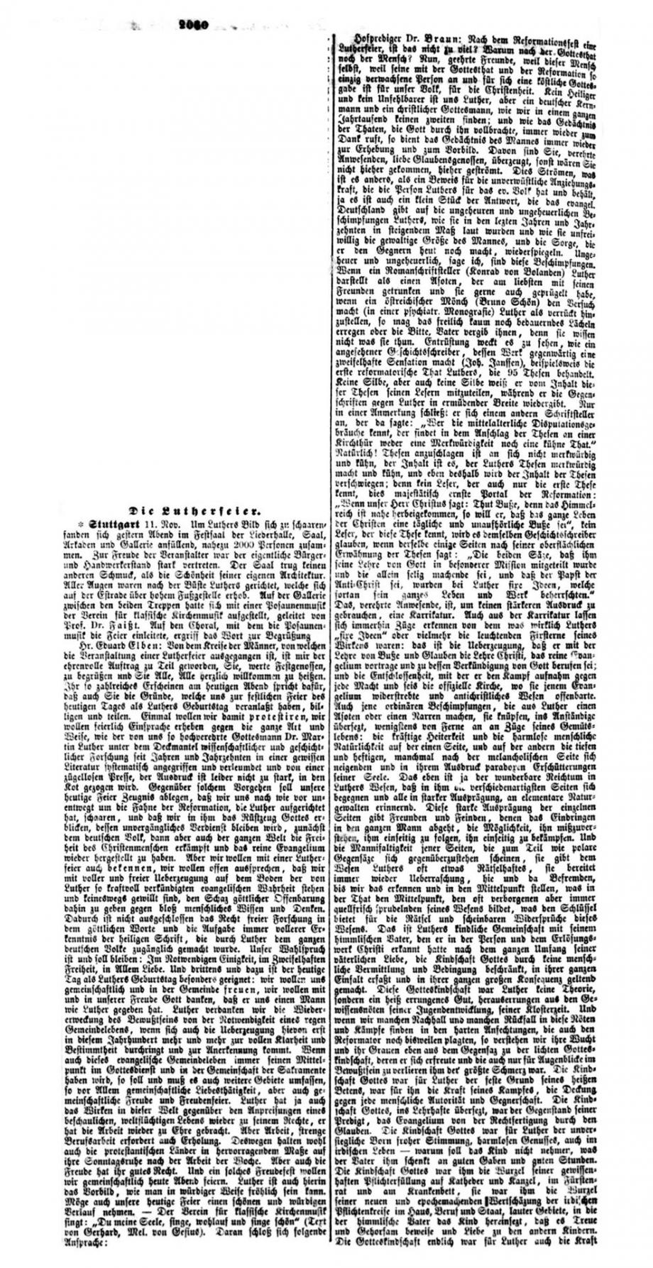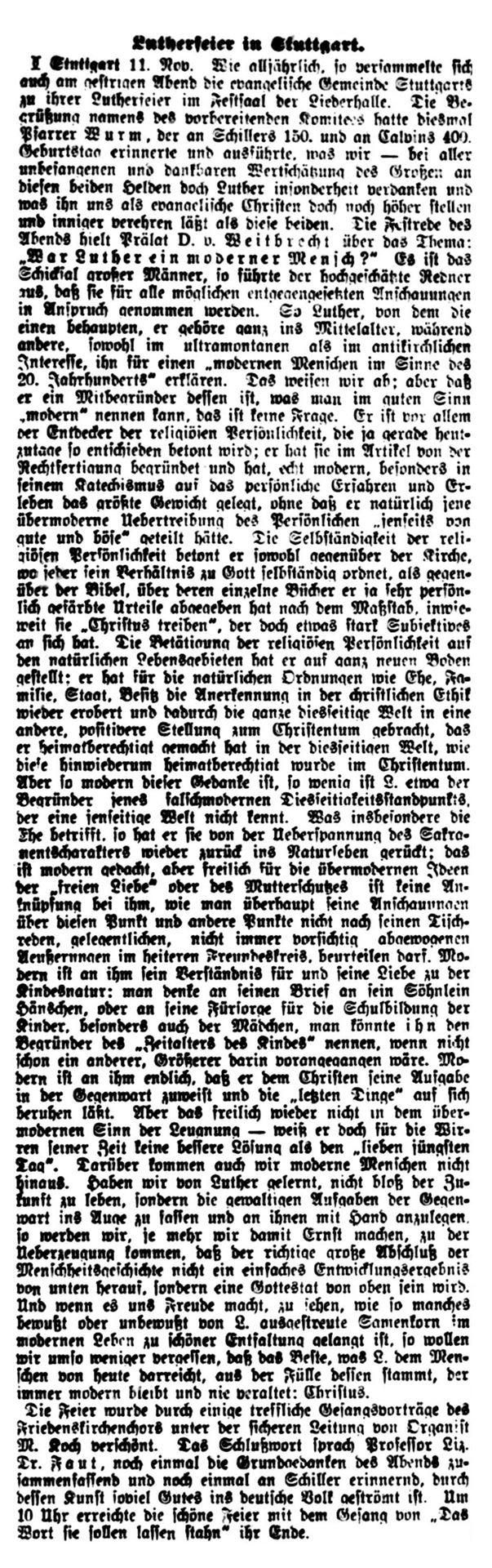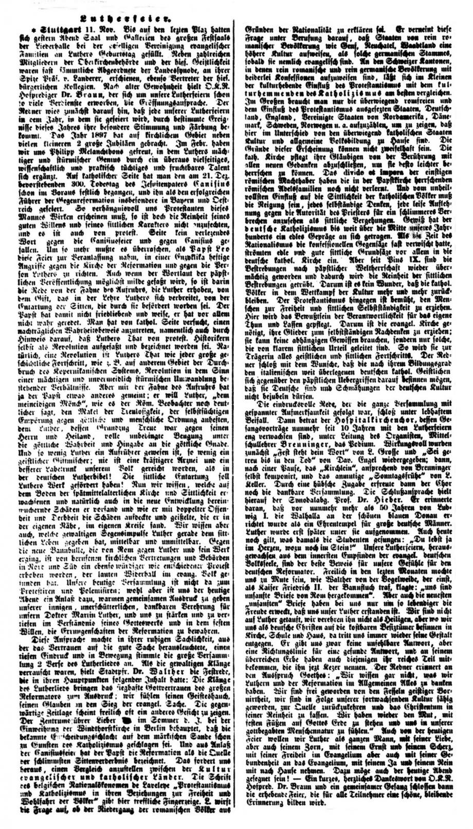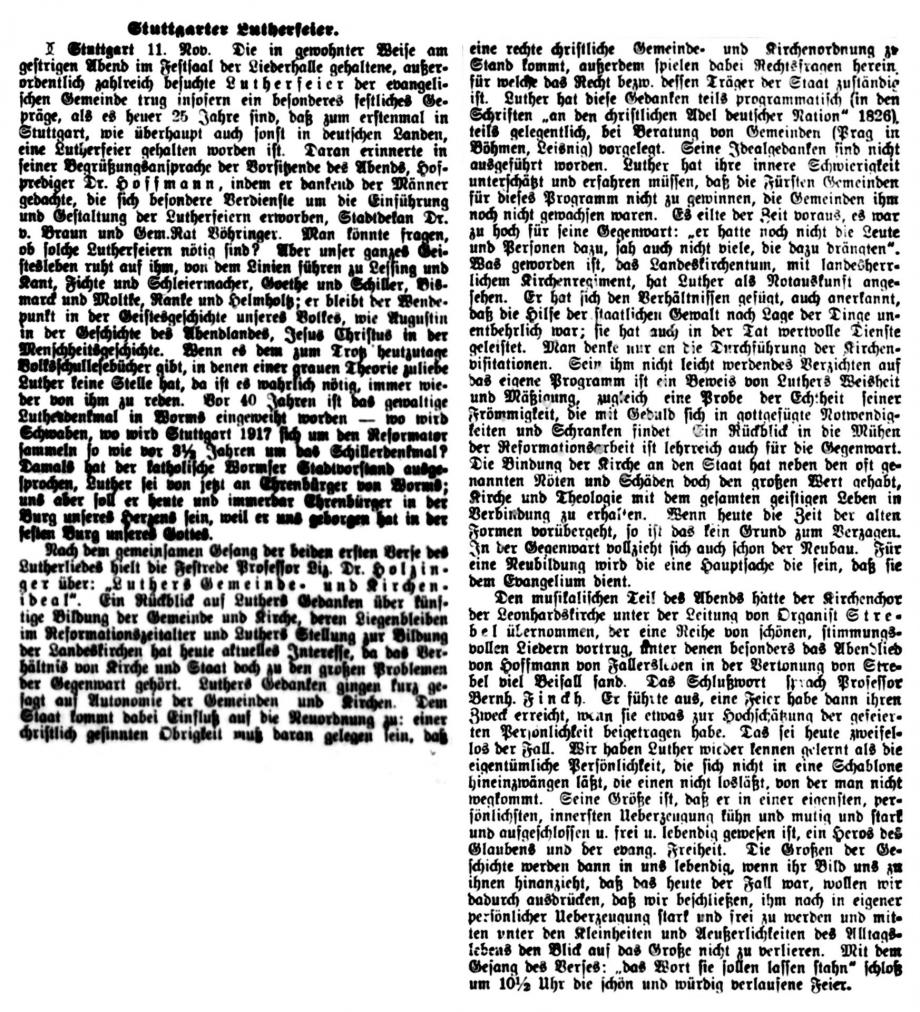Stuttgart 1. Nov. Das Reformationsfest wurde gestern Abend in der Stiftskirche mit einem Gottesdienste gefeiert, der mit dem Vortrag des Lutherliedes „Ein‘ feste Burg“ durch den Stiftskirchenchor (Saz von Luther selbst) eröffnet wurde. Die Gemeinde sang Luthers Lied „Nun freut euch, lieben Christen g’mein“, worauf Helfer Gerock die Festpredigt hielt über die Worte des Proph.: „Aber auf dem Berge Zion sollen Etliche errettet werden und sollen Heiligtum sein“. Der Redner rief den Zuhörern als Nachlese des vor einem Jahre gefeierten Lutherjubiläums drei Reformationskleinodien ins Gedächtnis zurück, welche die Schule, die Kirche und das Haus durch Luther erhielten und die in der Bibel als Mittelpunkt der von ihm gegründeten deutschen Schule, in der Lehre von der Gerechtigkeit des Glaubens für die deutsche, evangelische Kirche und in der Einführung des deutschen Hauses bestehen, welch letzteres Luther selbst gründete, als er von der geistlichen Ehelosigkeit herabsteigend zum Traualtare trat. - -