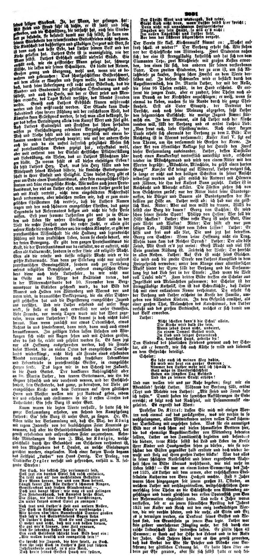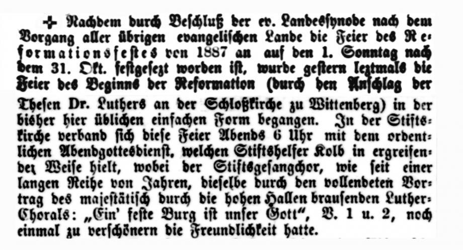 Stuttgart 29. Okt. Nachdem im vorigen Jahre wegen Begehung des Lutherjubiläums eine besondere Feier des Beginns der Reformation (durch den Anschlag der Luther’schen Thesen an der Schloßkirche zu Wittenberg) am 31. Okt. unterblieben war, findet letztere Feier heuer wieder statt, und zwar wird hiebei der beliebte Kanzelredner: Helfer Gerock von St. Johann in der Stiftskirche Abends 6 Uhr auftreten. Bisher hatte der Stiftsgesangchor die Freundlichkeit, diese Feier durch den Vortrag des herrlichen Chorals: „Ein‘ feste Burg ist unser Gott“, welches Lied so erhebend die Kirchenhallen durchbraust, zu erhöhen. –