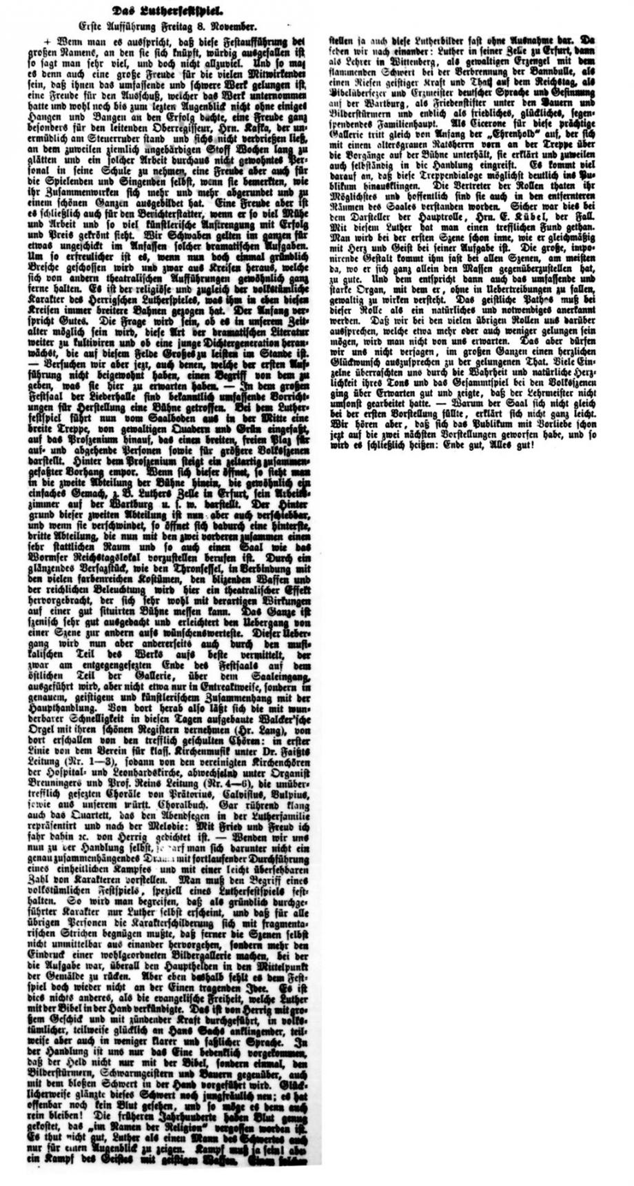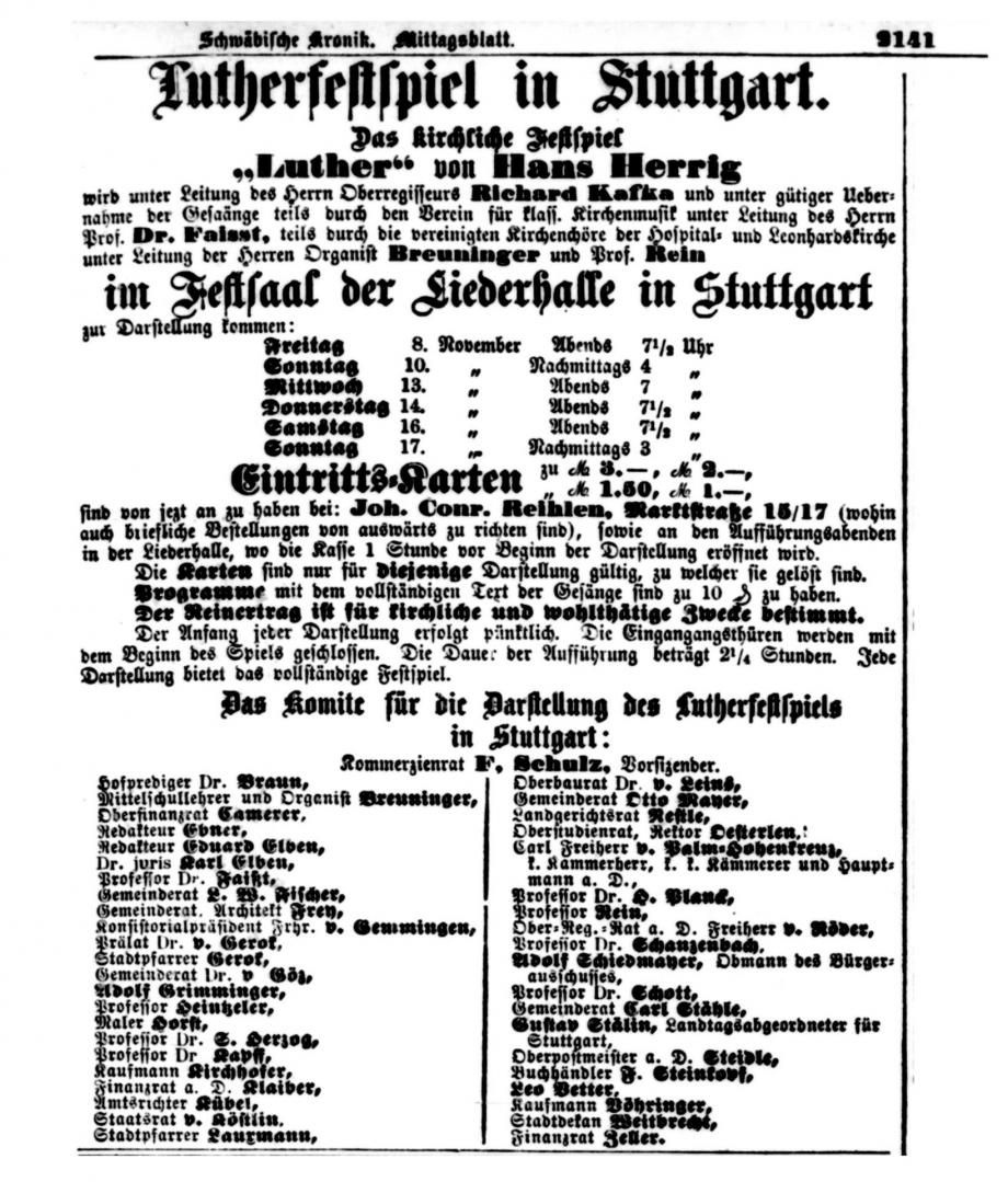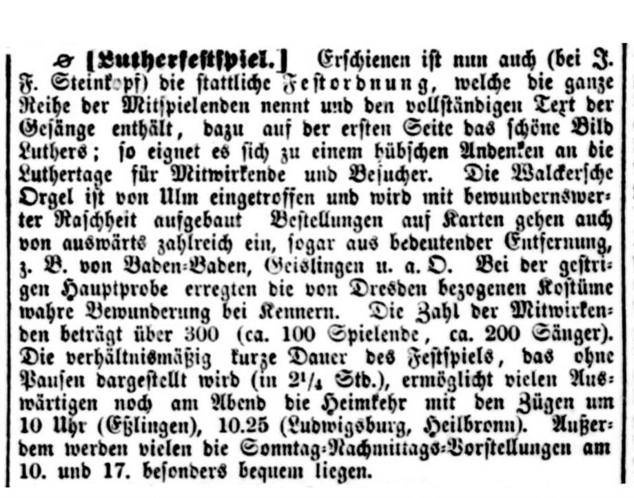 fand ein großes Luther-Festspiel statt, an welchem etwa 300 Mitwirkende beteiligt waren. Vorankündigungen, Anzeigen und Berichte in der Schwäbischen Kronik: