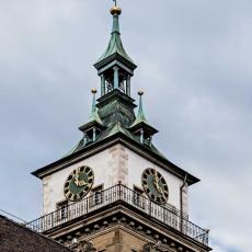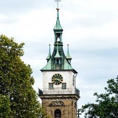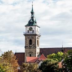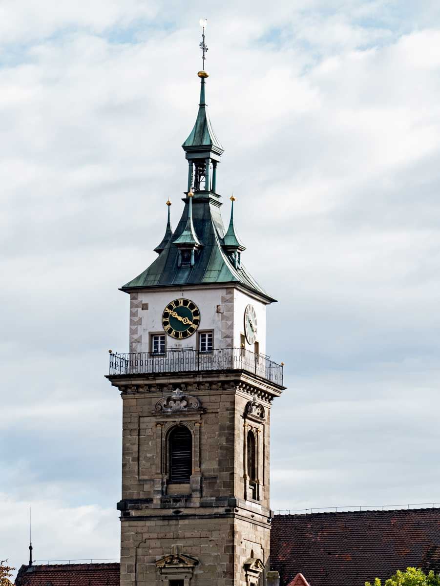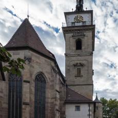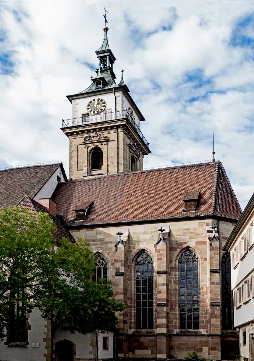 "Heinrich Schickhardt erbaute in den Jahren 1612 bis 1613 den heutigen Renaissance-Turm als Ersatz für den ursprünglich niederen gotischen Turm. Neben seiner Schönheit ist der Turm auch eine technische Meisterleistung. Der Steinturm hat im Innern einen zweiten Turm aus schweren Hölzern, der die Schwingungen der Glocken auf die Fundamente hinableitet und so den äußeren Turm entlastet."