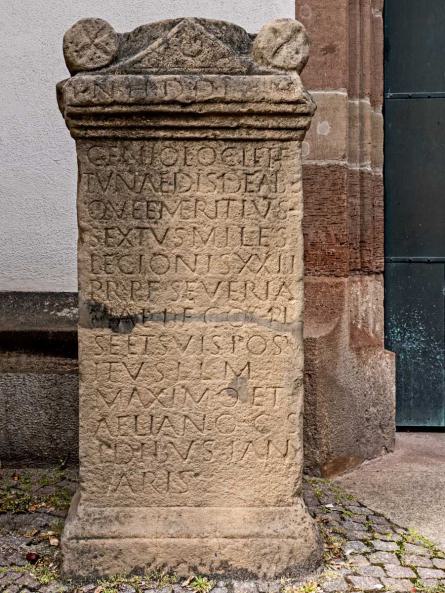 Emeritius Sextus war Kommandant der römischen Straßenstation bei der heutigen Uffkirche. Nach Beendigung seiner Dienstzeit stellte er aus Dank für deren guten Verlauf diesen Weihealtar für die Götter Jupiter, den Schutzgeist des Ortes, für Fortuna und alle anderen Götter und Göttinnen auf. Der Altar wurde im 16. Jh. bei der Uffkirche gefunden.