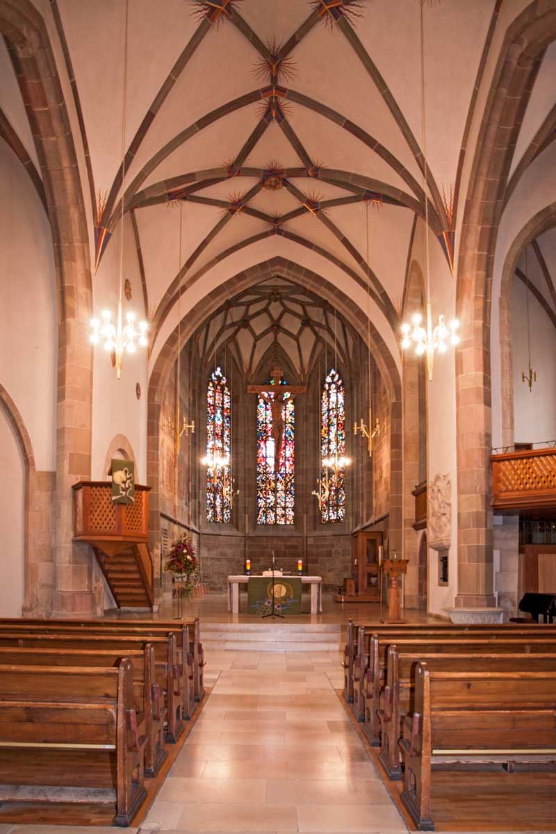 Der Chor besteht aus zwei ungleich langen Vorjochen, denen sich im Osten ein fünfseitiges Chorpolygon anschließt. Das spätgotische Rippengewölbe befindet sich in originalem Zustand. Die Gcwölbefiguration mit drei zentralen Sternfiguren zeichnet sich durch eine große technische und ästhetische Einheitlichkeit aus und ist ein Höhepunkt im Werk Aberlin Jörgs. Er hat sich mit seinem Sternenwappen im östlichsten Schlußstein des Chores verewigt. Seitlich befinden sich die Schilde der beiden Nebenmeister, die den Bau vor Ort leiteten.