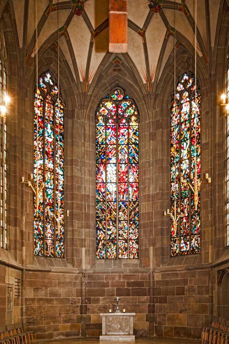 Die drei östlichen Chorfenster der Cannstatter Stadtkirche wurden 1963 von Wolf-Dieter Kohler mit Glasmalereien ausgestaltet.
