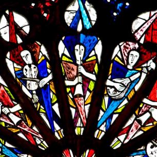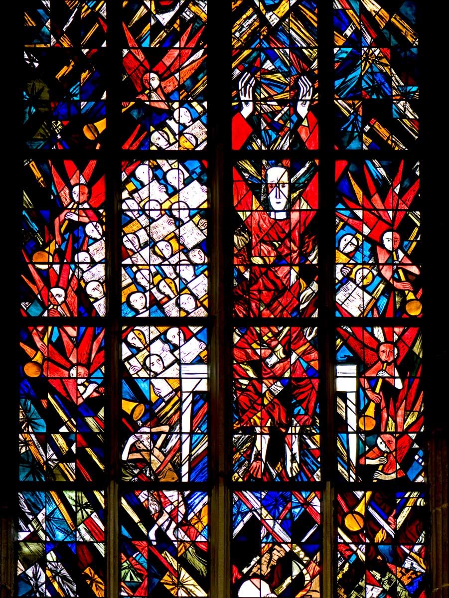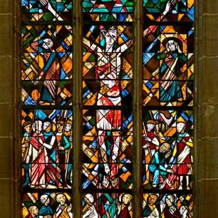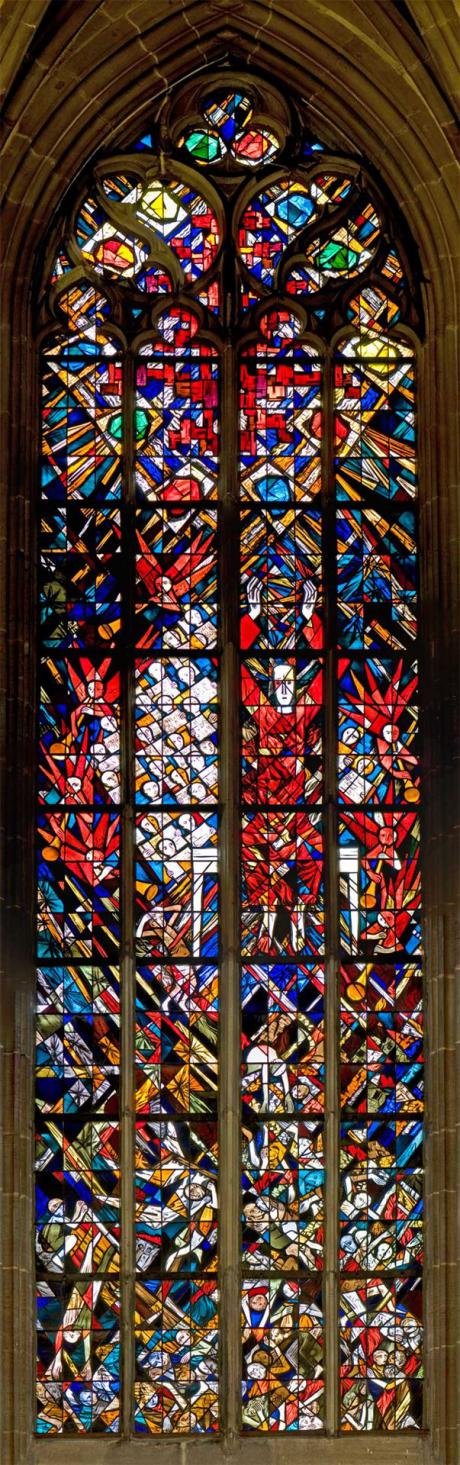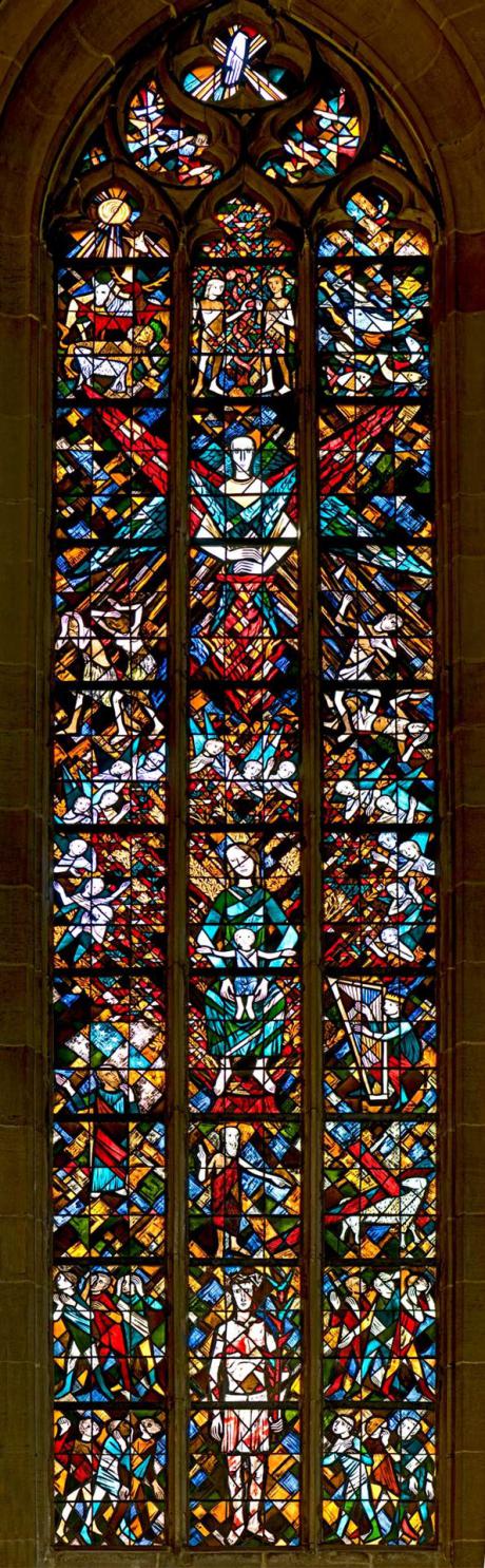Das mittlere Fenster schließlich zeigt die Erfüllung beider Schriften nach der „Offenbarung des Johannes": Christus als wiederkehrender Weltenrichter beim Jüngsten Gericht. Darüber ist das Ziel aller Gläubigen, das ewige Leben im Reich Gottes, in der Himmlischen Stadt Jerusalem, dargestellt.