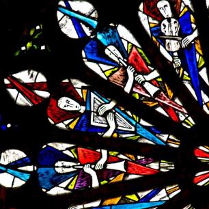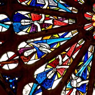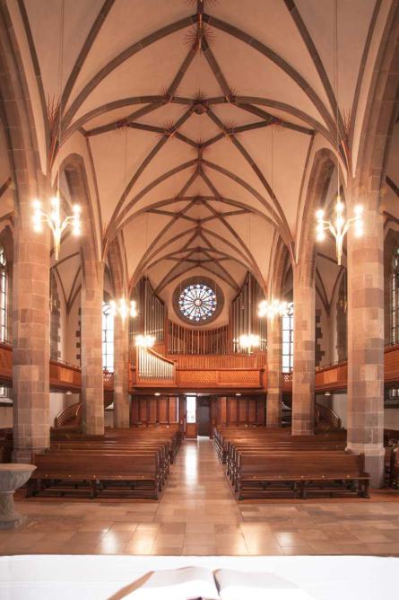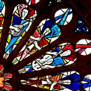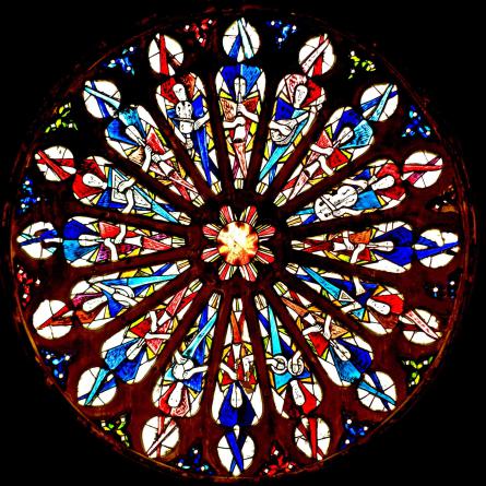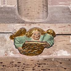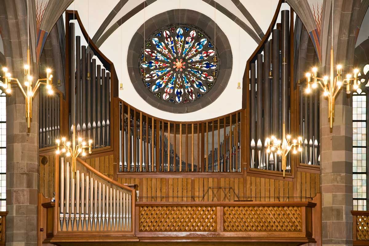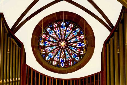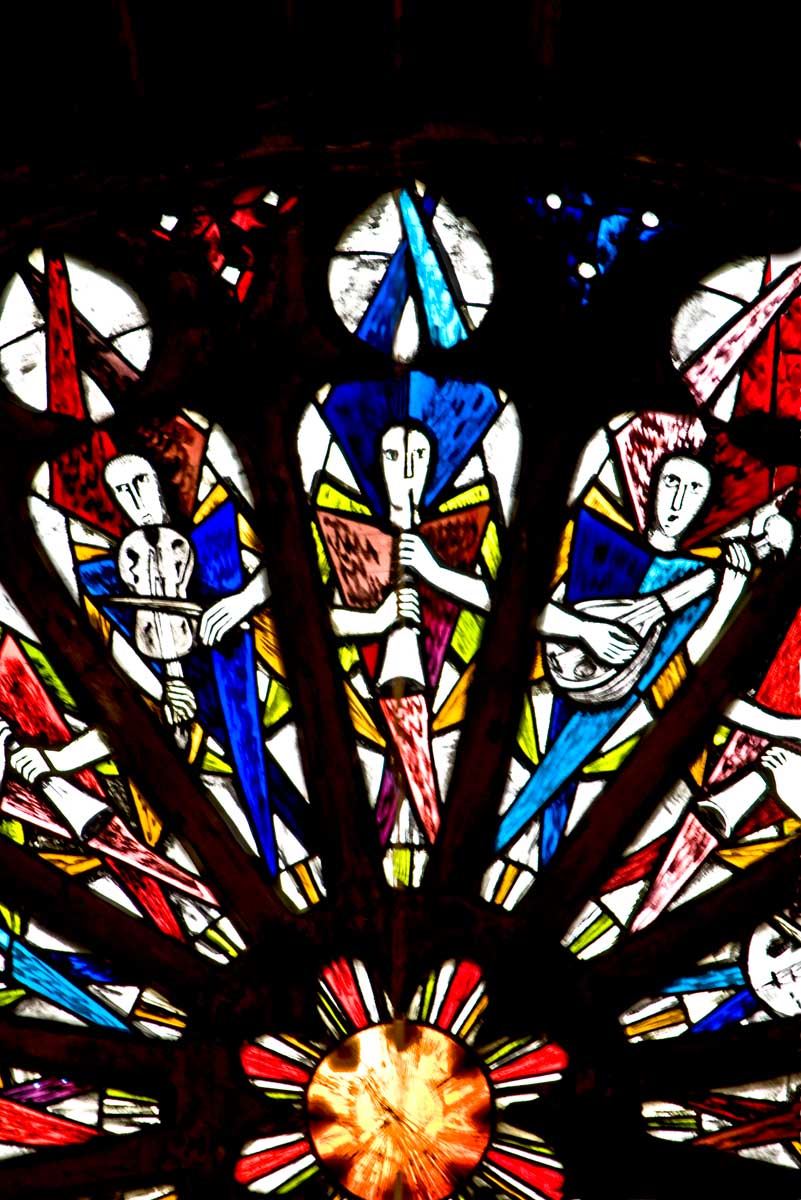 "...Die Rosette über dem Westportal zeigt in 16 Segmenten Engel mit verschiedenen Musikinstrumenten. Die Rosette erscheint so im Thema wie auch in der Form der Orgel harmonisch zugeordnet." (Kirchenführer)