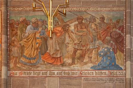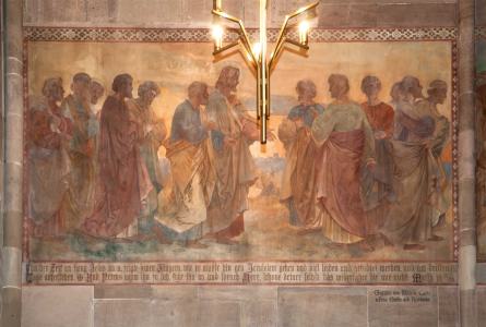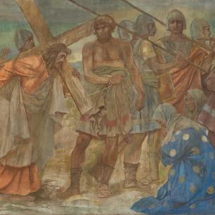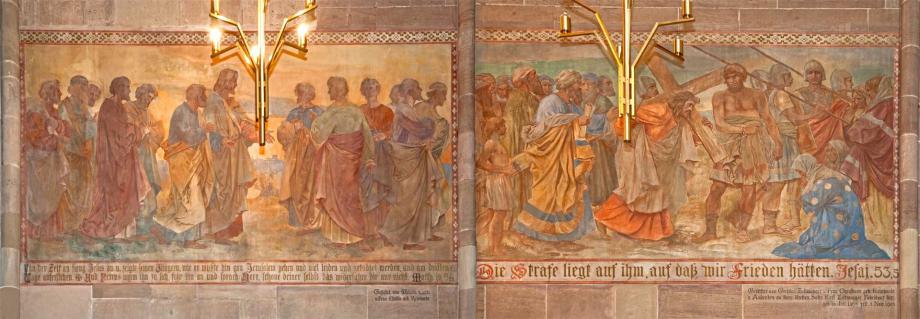 A Wandgemälde, 1906, von Rudolf Yelin d. Älteren: „Erste Leidensankundigung" und „Kreuztragung"