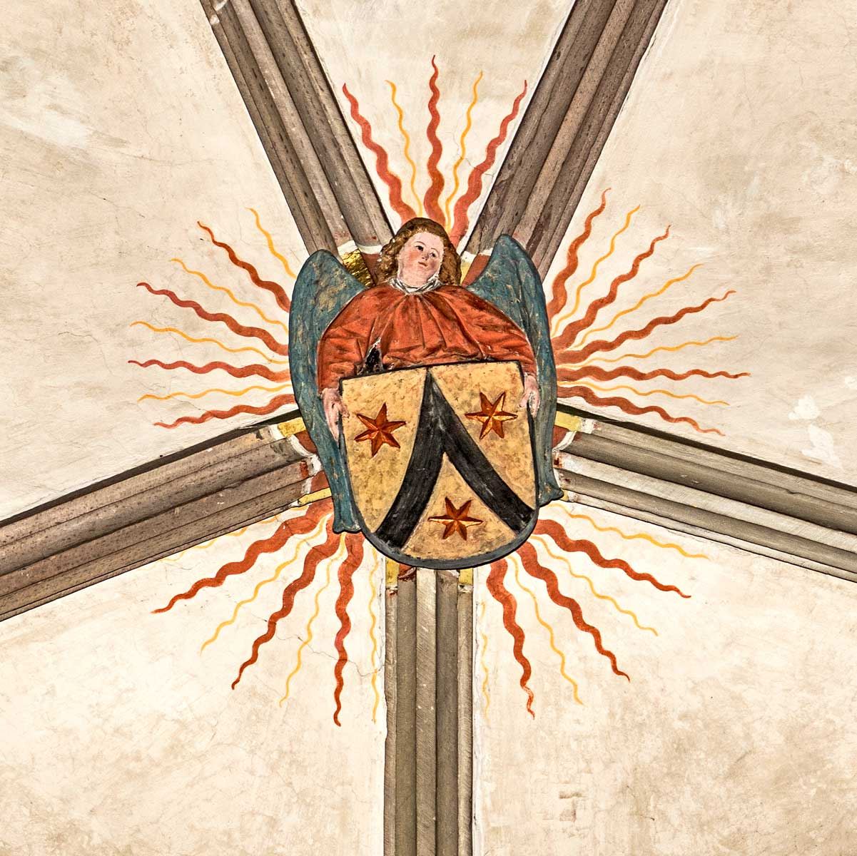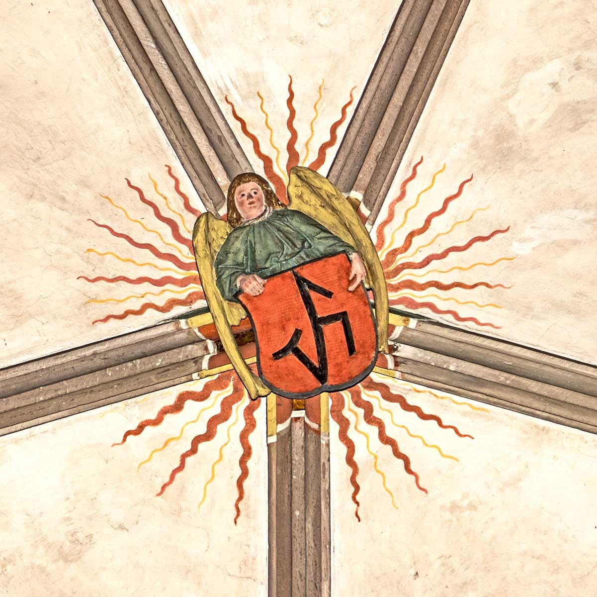 Die Schlußsteine im Chorgewölbe, im Turmerdgeschoß und in der Sakristei sitzen an ihren ursprünglichen Stellen. Die heute an den Seitenwänden eingemauerten fünf Schlußsteine stammen aus dem originalen, 1791 abgebrochenen Langhausgewölbe. Sie wurden 1905 an ihren jetzigen Standorten eingesetzt.