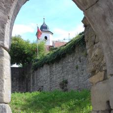 LInks die Burg, in der Mitte die ehemalige Kirche, daneben das Pfarrhaus