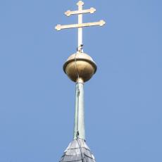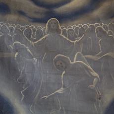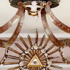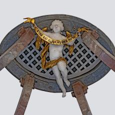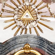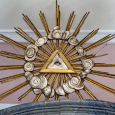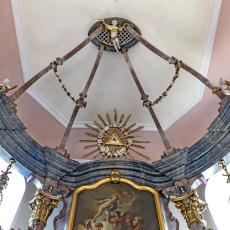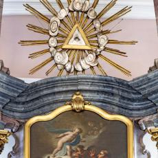 Oben in der Mitte ist er bestimmt von einem wolkenumrahmten Strahlenkranz und einem darin in seiner geometrischen Anordnung im gleichschenkligen Dreieck wachenden Auge Gottes. Es symbolisiert die Göttliche Dreieinigkeit und die Allgegenwart Gottes.
