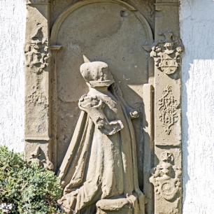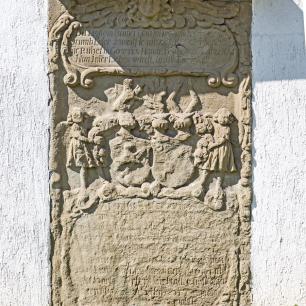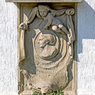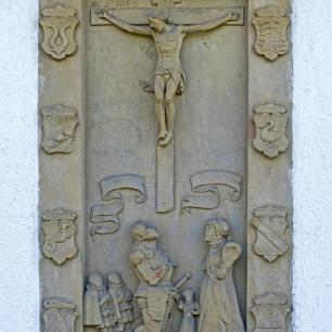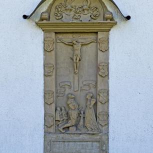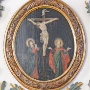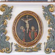 Das Ovalbild an der Emporenbrüstung ist im frühen 18. Jahrhundert entstanden, kopiert eine Komposition um 1520. Der Gekreuzigte mit Hll. Maria und Johannes.