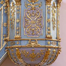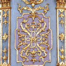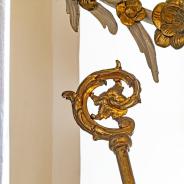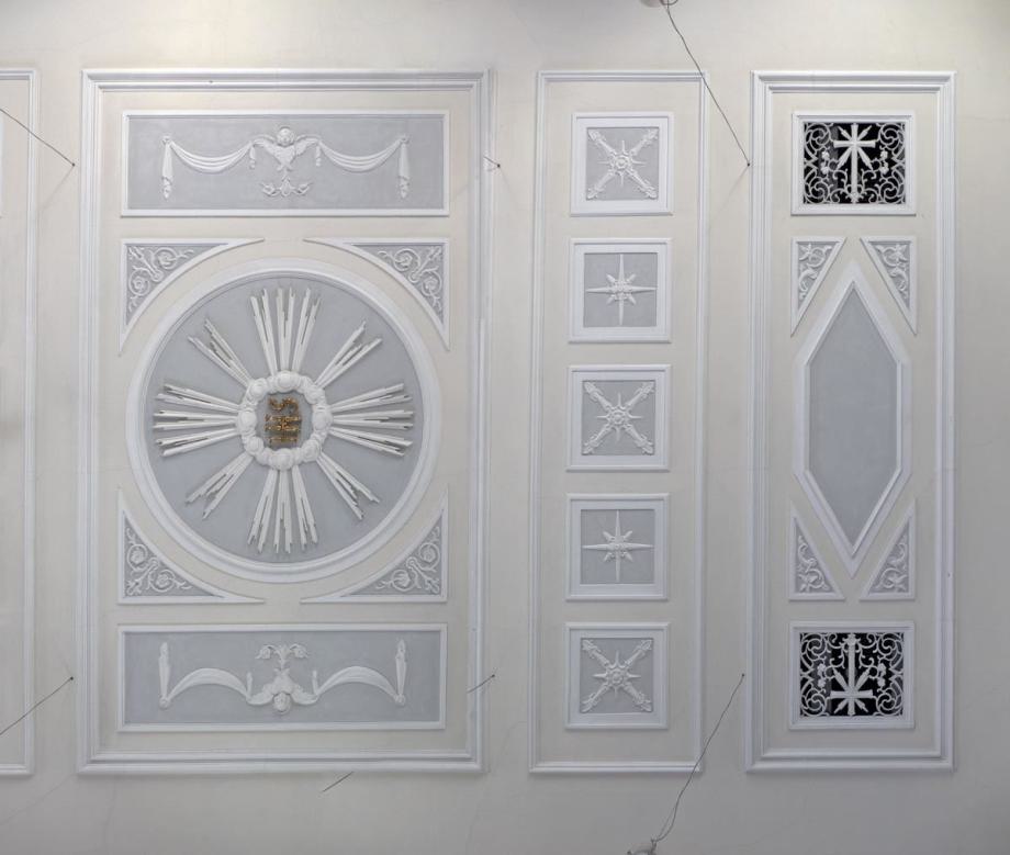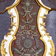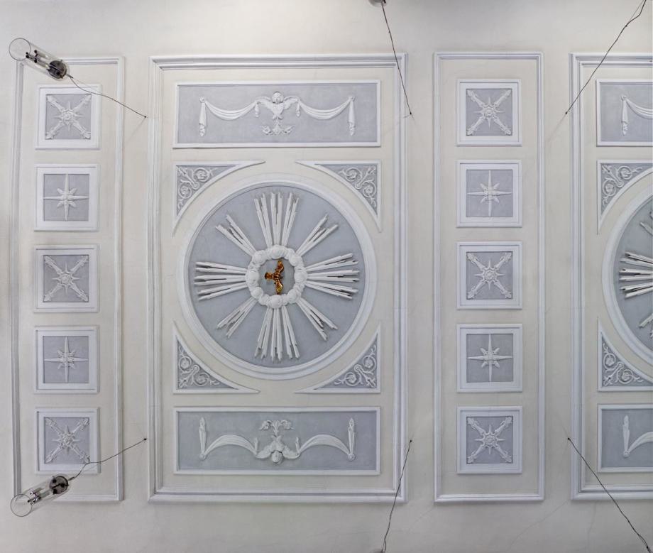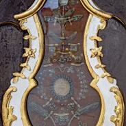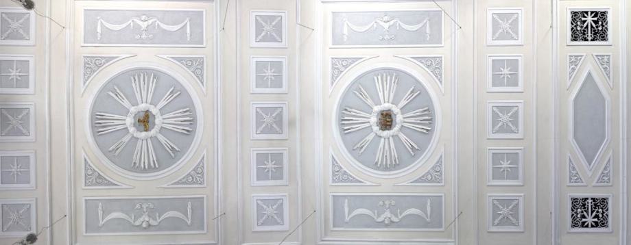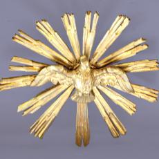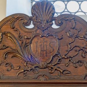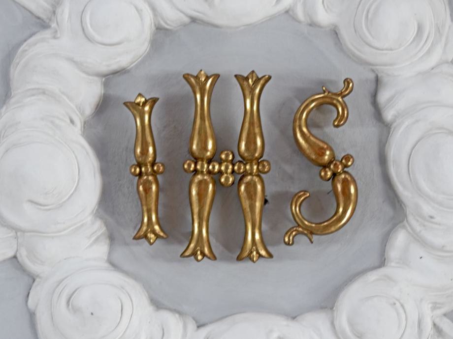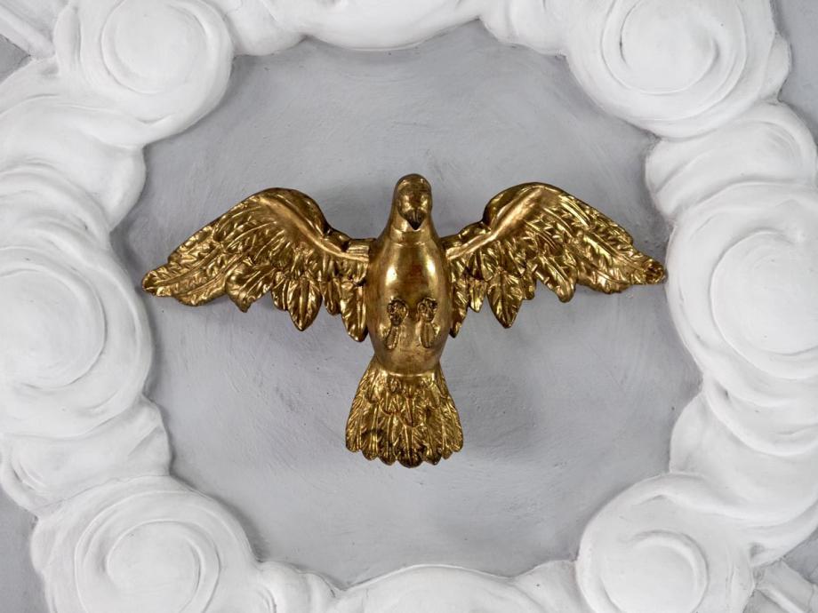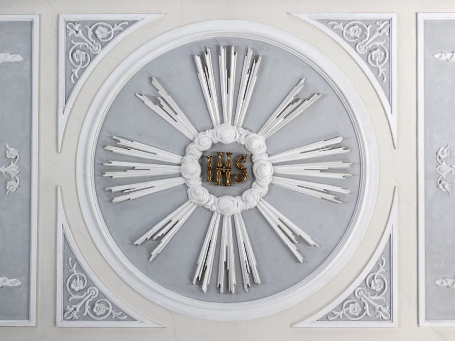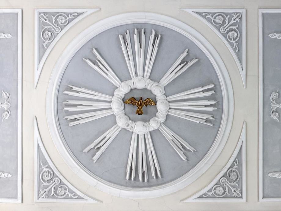 Im Mittelteil der Stuckdecke Darstellung des heiligen Geistes in Gestalt einer Taube und ein Christus-Monogramm (JHS)