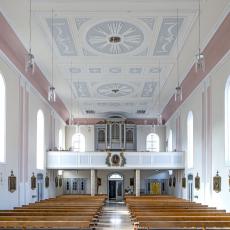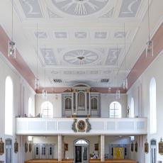 Und so erhielt der gesamte Kirchenraum im Zuge dieser Maßnahmen eine dezente „Stuckierung mit leicht differenzierter Farbtönung“. Anstelle eines Deckengemäldes schuf die Fa. Kaiser aus Iggingen die heute noch zu sehende „einfache Ornamentik in leichten Architekturlinien“.