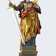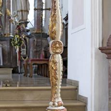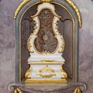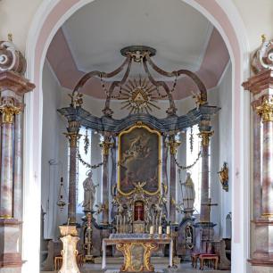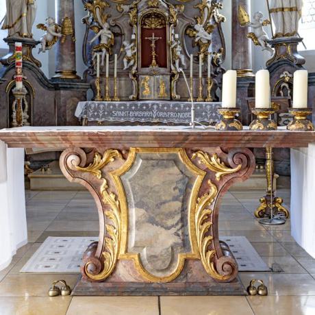 1784 geweiht der Hl. Barbara, (in der Oeffinger Klosterkirche 1778 ursprünglich dem Hl. Antonius von Padua geweiht) entspricht einer offenen Baldachinarchitektur mit vier Säulen.