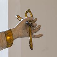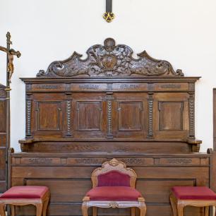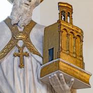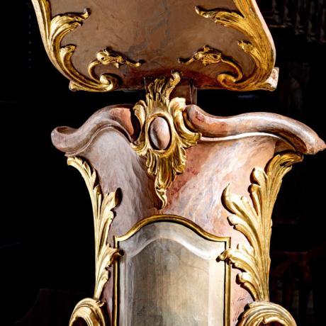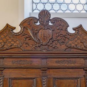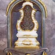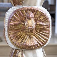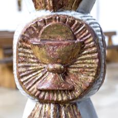 Über dem darüber angeordneten dreifach drehbaren Aussetzungs-tabernakel (dem Thron) versinnbildlicht der sich für seine Jungen aufopfernde Pelikan unseren Herrn Jesus Christus, der uns seinen Leib und sein Blut zur Speise gibt.
