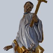 7.21 - 7.23: Etwas unterhalb des Rundbogenfensters auf der rechten Seite des Langhauses sehen wir rechts neben dem Bild der ersten Kreuzwegstation in einer geschnitzten Plastik den Hl. Sebastian dargestellt. Bei dieser Skulptur handelt es sich um die Kopie eines spätgotischen Originals, welche der Gemeinde aus Privatbesitz 1914 geschenkt wurde. Sie hat seit 1973 ihren Platz an dieser Stelle der Kirche.