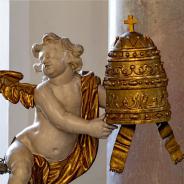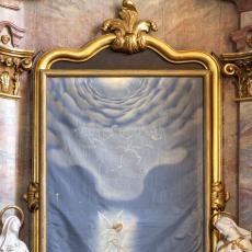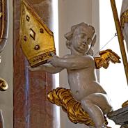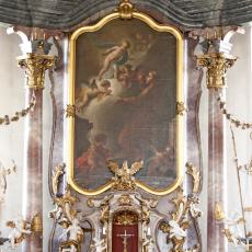 Über dem Altarbild halten zwei schwebende Engelsfiguren die Krone über die Königin des Himmels und der Erde.