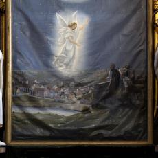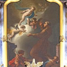 Auf dem sehr dunkel erscheinenden Altargemälde ist der Hl. Franziskus in seiner nur von einem Öllämpchen schwach erhellten Mönchszelle dargestellt, wie er sein Kreuz aus den Händen eines Engels entgegennimmt.