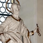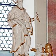 Links und rechts des Hochaltares sind in Lebensgröße die aus Holz geschnitzten weiß polierten Statuen des Hl. Petrus (mit Evangeliar und Schlüssel) und des Hl. Wolfgang (mit Bischofsstab und dem Modell einer Kirche) zu sehen.