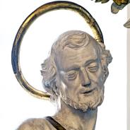 7.31 + 7.32: An der rechten Wandseite zwischen dem Herz Jesu–Altar und dem Aufgang zur Kanzel befindet sich eine 1976 in der Hüttlinger Künstlerwerkstatt von Josef Wolfsteiner geschaffene Holzplastik mit der Darstellung des Hl. Josef.