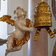 3.84: Glocke, 3.85 + 3.86: Leuchterengel (2. Hälfte 17. Jh.) am Chorbogen, 3.87 + 3.88: Schlussstein aus dem Kreuzrippengewölbe der um 1353 erbauten Vorgängerkirche.