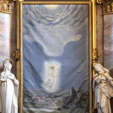 Auf dem Altargemälde ist die in Licht gehüllte makellose Jungfrau Maria (Immaculata) dargestellt. Als Königin des Himmels steht sie auf einer Erdkugel und zertritt mit ihrem Fuß den Kopf der höllischen Schlange, welche den Apfel der weltlichen Sünde in ihrem Gebiss hält.