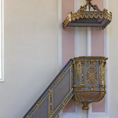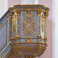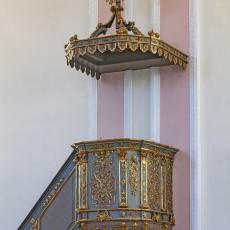 Wann genau die Kanzel geschaffen wurde ist nicht bekannt. Es ist jedoch davon auszugehen, dass sie wohl zunächst am Chorbogen der al ten Kirche angebracht war. Sie wurde 1784 etwas modifiziert und hat seither ihren Platz im Langhaus der Kirche rechts vor dem Herz Jesu– Altar. Die heutige Verkleidung des Treppenaufgangs wurde 1956 stilgerecht angepasst.
