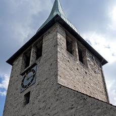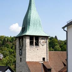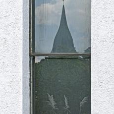1.90: Der Turm der Thomaskirche spiegelt sic h in einem Fenster der St. Antoniuskirche (gegenüber auf der linken Talseite)