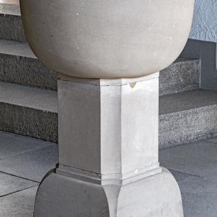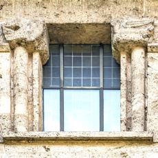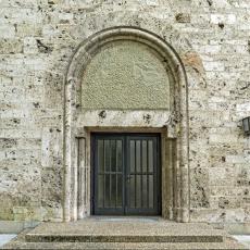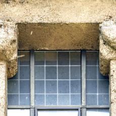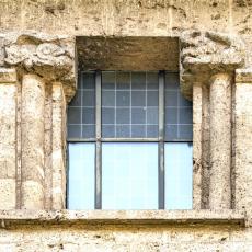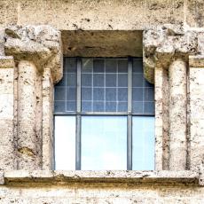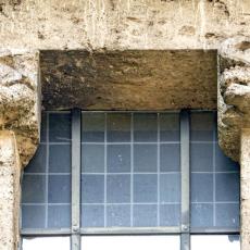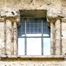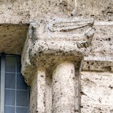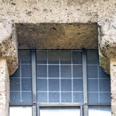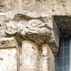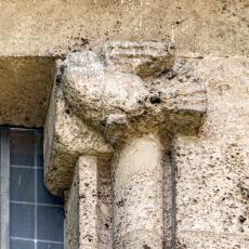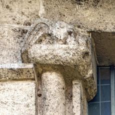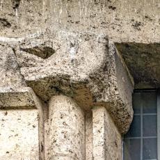 Einzig die Oberfenster an der Ostseite tragen Schmuck: Halbsäulen / Kapitelle mit Tierfiguren. (leider wegen der steilen Hanglage kaum erkennbar)