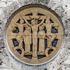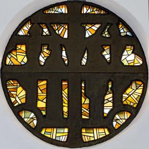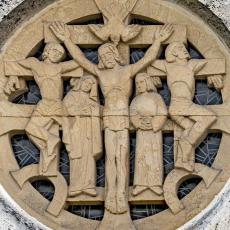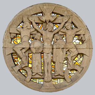 Die markante Nordseite / Turmfront ziert ein Fensterrelief von Helmut Uhrig (1938). Dargestellt ist die Kreuzigungsszene - Christus (1.49) mit den beiden "Schächern" (1.47 & 1.51), dazu Maria (1.48) und Johannes (1.50). Heilig-Geist-Taube über Christus. Würdigung durch Albrecht Strebel, Gegenüberstellung zum Altarfresko Göppingen 1937 s.u.