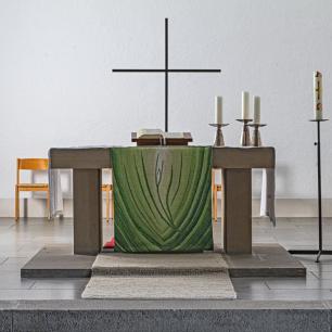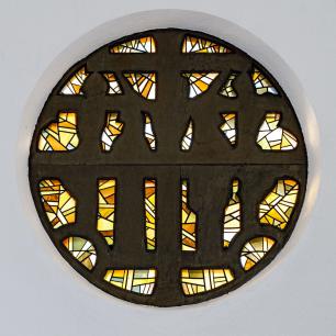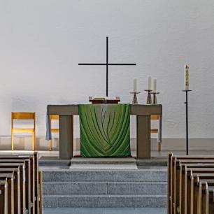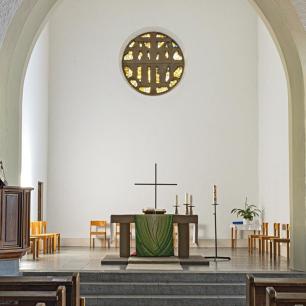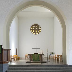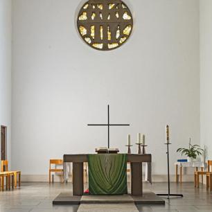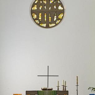Der schlichte Chorraum wird geprägt durch den Altar und das Rundfenster, das die Nordwand außen so markant dominiert. Hierzu Ulrich Zimmermann: