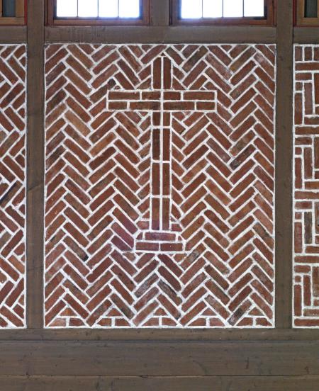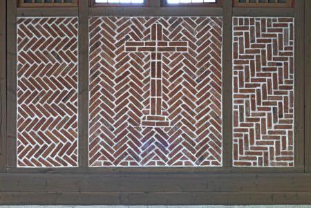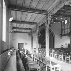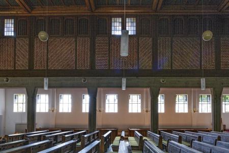 Die Fach- und Tragwerkstruktur (alt: grazil, Leichtigkeit; neu: Beton, schwer) mit den hellen Putzgefachen und die dadurch bessere Raumhelligkeit vor dem dunkleren Turmchor passten 1938 perfekt zueinander. Die Nachkriegsversion stellt das auf den Kopf. Eine Chor-Ausleuchtung ist gut gemeint, aber aussagefremd und stört die Schattenriss-Absicht von innen nach außen. Die alte Einzelbestuhlung war filigran und modern-flexibel, die "neuen" Bankreihen: sehr massiv. Die Materialwahl 1938 zeittypisch angemessen: einfach, sparsam, Gänge in Ziegelstein, seit 1950 oder später: wertige große Fliesen. Der bauzeitliche Charakter der Kirche mit einem Hauch von Bescheidenheit, minderheitlichem Provisorium und akzeptiertem Unbehaustsein.